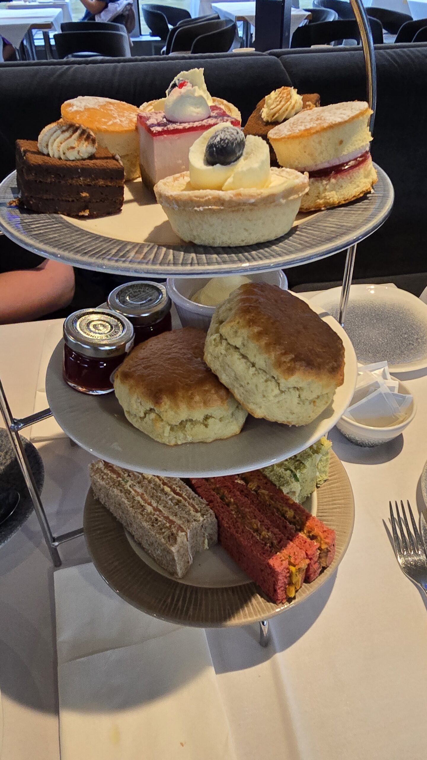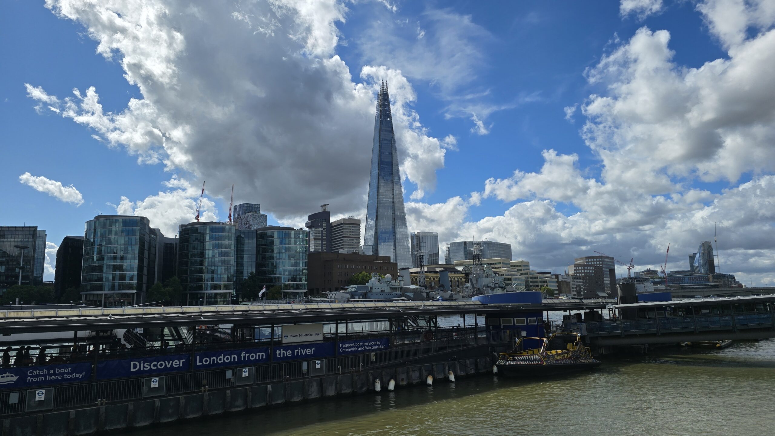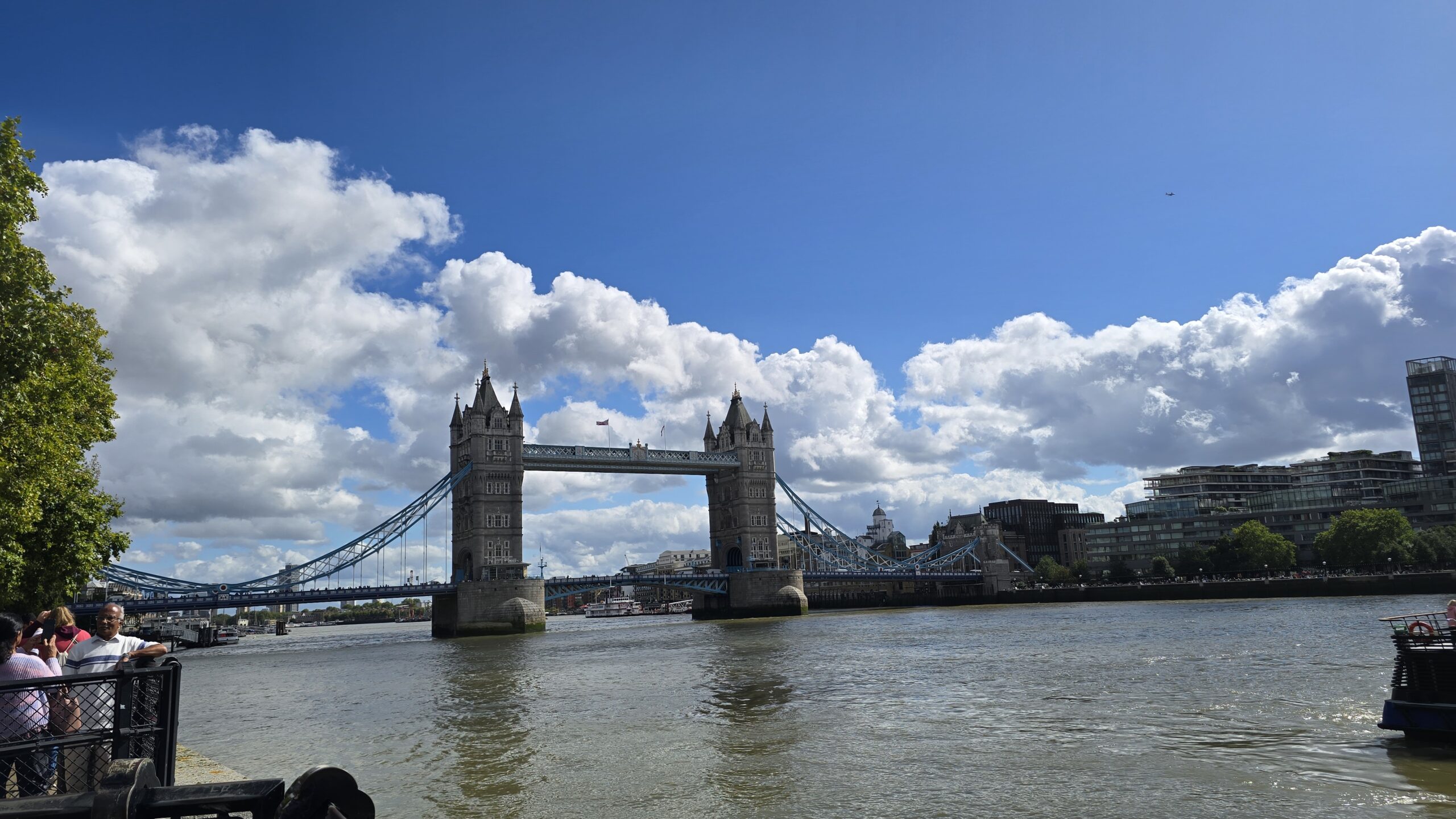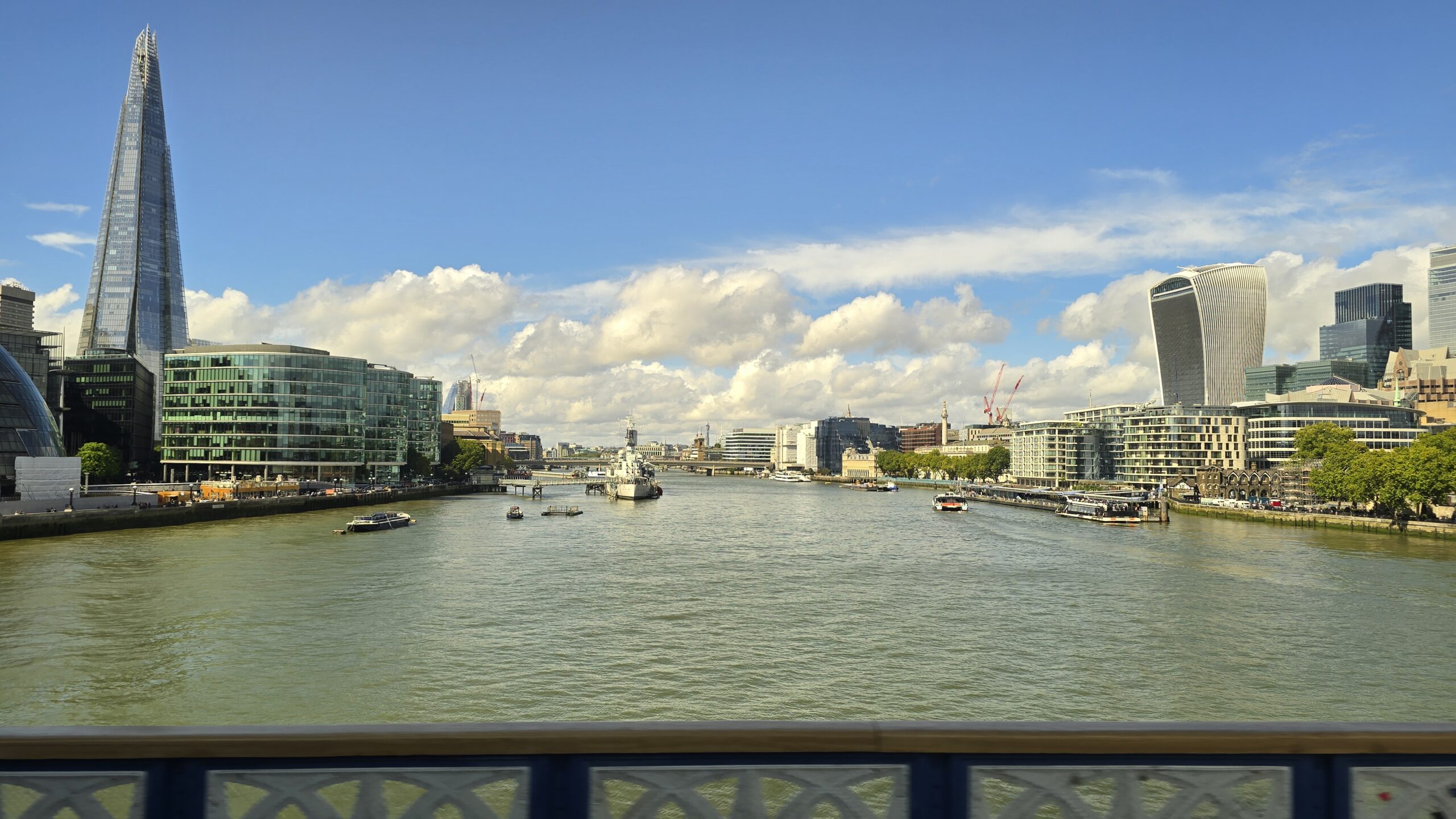 Am frühen Nachmittag treffen wir uns am Pier und checken auf unser Schiff ein. Es bleibt aber nicht bei der Fahrt auf der Themse- ein ausgesprochen leckerer Afternoon Tea erwartet uns. Sandwiches, Scones mit Clotted Cream und Erdbeermarmelade und kleinen Pralines zum Abschluß. hmmm. So entdecken wir London von der Themse aus, sehen noch einmal die Houses of Parliaments und den Elisabeth-Tower mit Big Ben, dann geht es retour und Richtung Greenwich. Highlight natürlich die Fahrt unter der Tower Bridge hindurch.