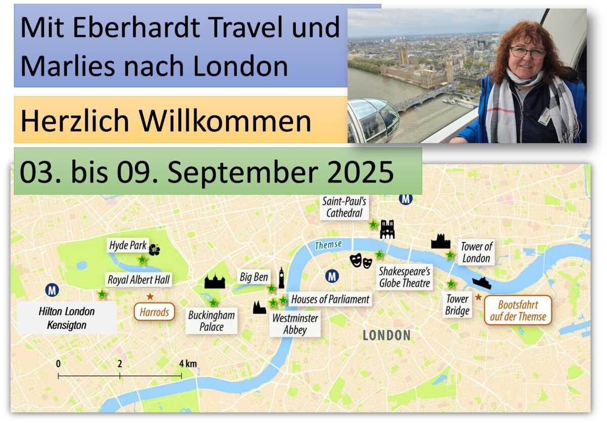 Von Dresden, München, Berlin,Hamburg und Düsseldorf starten wir heute nach London. Am Flughafen Heathrow treffen wir uns, das Wetter ist nicht so toll und so mussten alle Flieger auf eine Landeerlaubnis warten. Das Kreisen über der Stadt ermöglichte uns aber einen Blick durch die Wolken: auf das Riesenrad und den Buckingham Palast, die Themse und ihre Brücken. Alle haben die gleiche Verspätung, so bleibt uns das lange Warten erspart. Ein Bus bringt uns zum Hotel im vornehmen Stadtteil Kensington. Check-in ist kein Problem, auch unsere individuell angereisten Gäste sind da