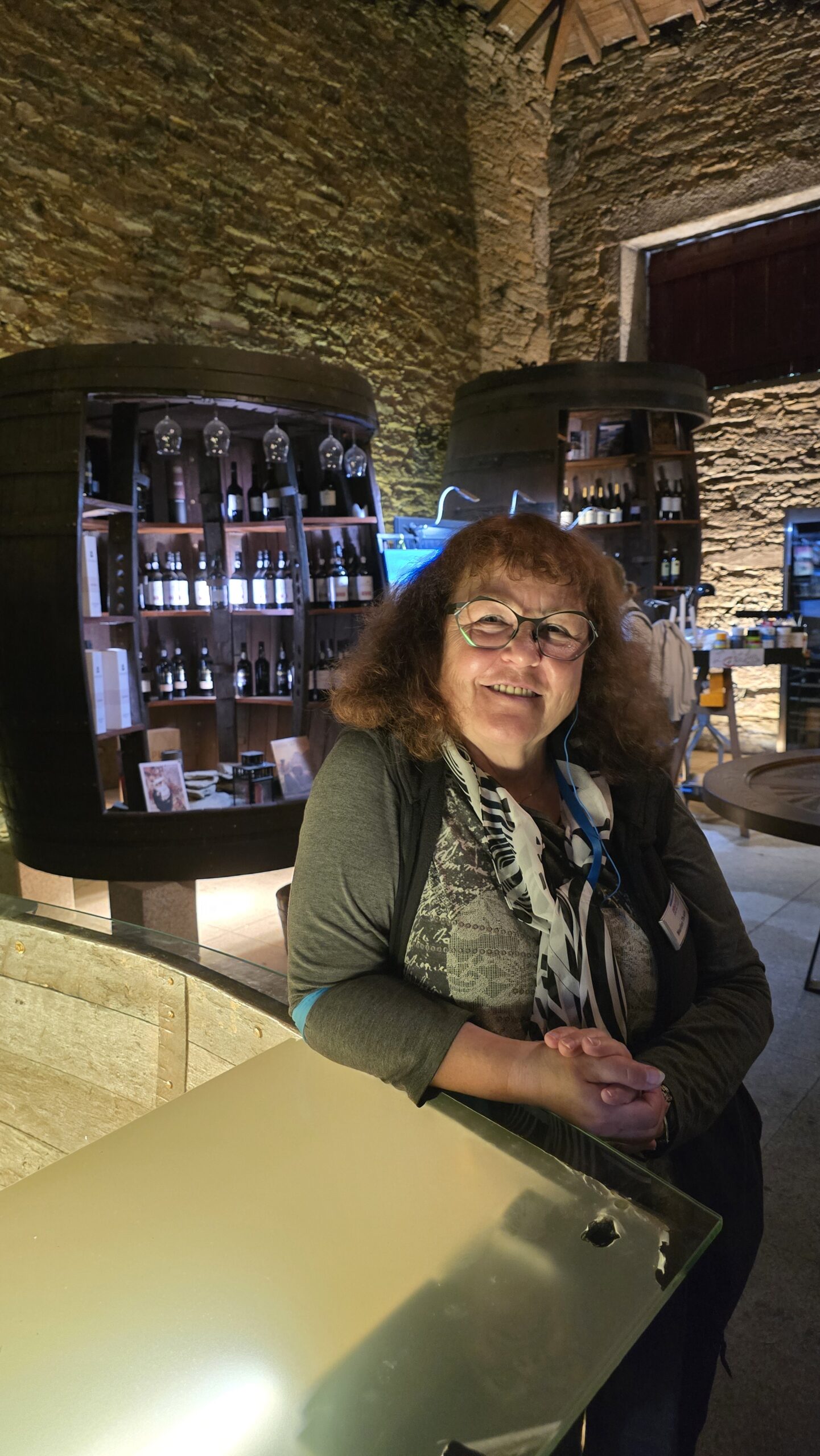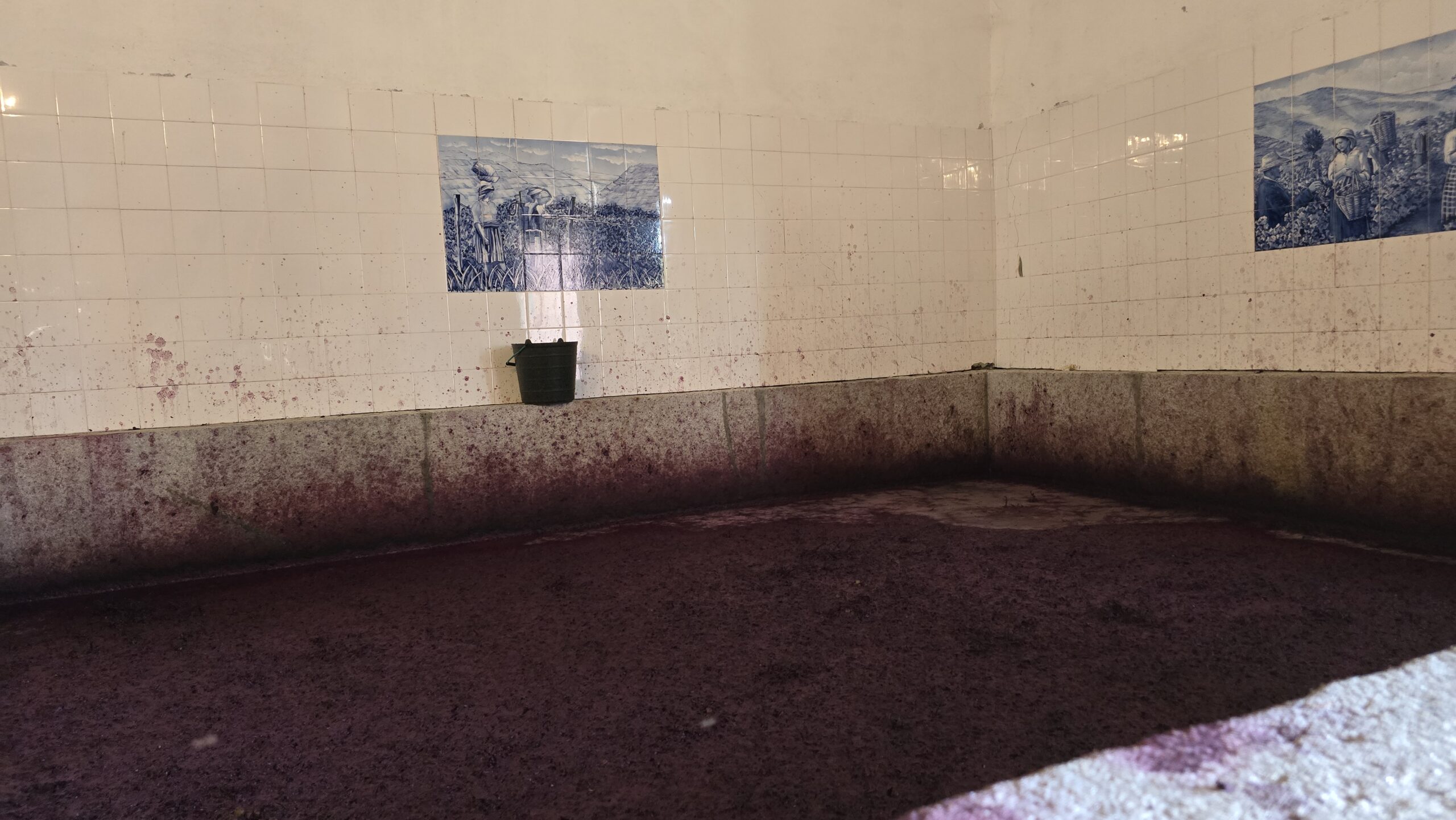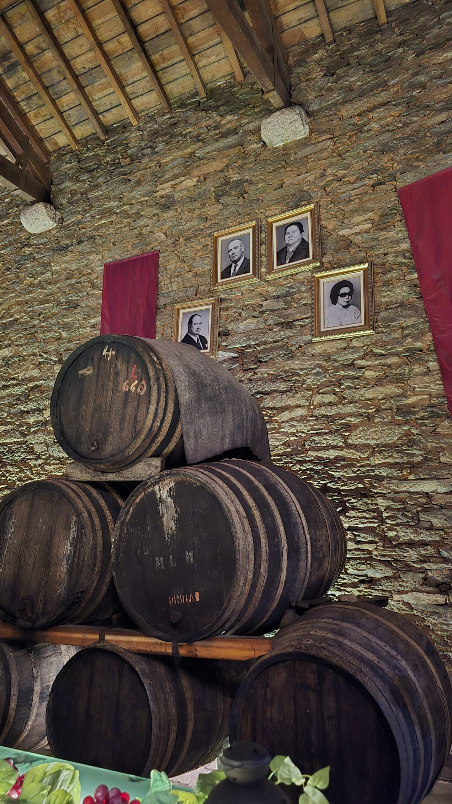 Ein Familienbetrieb, Gabriel wird uns führen, doch zuvor müssen wir schließlich kosten, was sie hier produzieren. Wir beginnen mit einem Weißwein- naja, steigerungsfähig für unsere Kenner (HobbyKelterer), dann folgen ein Roter und ein Rose. Gut, dass ich für einen kleinen Imbiss gesorgt hatte. Das Ambiente ist umwerfend, Sitzgelegenheiten unter der Pergola, Schaukeln, Aussichten ins Tal, Rosen und Reben, soweit das Auge reicht… Dann zeigt uns Gabriel das Anwesen und wir kommen gerade noch rechtzeitig. Die Ernte ist nämlich abgeschlossen und die letzten Trauben werden vergoren. Das passiert hier tatsächlich noch traditionell mit dem Füssen- die Trauben werden gestampft. Gabriel erzählt, dass nur der Mensch es schafft, dass beim Stampfen nicht die Kerne und Schalen zerstört werden, wie es eine automatische Presse unweigerlich tun würde. So vermeiden sie Bitterstoffe der Kerne und können einen exzellenten Wein herstellen. Von den Traubenbecken geht es zu den Fasslagern, und da gibt es tatsächlich noch Fässer der Großeltern-Generation, die nur für Ostern und besondere Gelegenheiten (auch für Versteigerungen für caritative Zwecke) abgefüllt werden. Und hier geht die Verkostung weiter 🙂 Natürlich können wir die eine oder andere Flasche erstehen und dann geht es die Serpentinen wieder hinunter. Immerhin waren wir auf über 600 Meter.