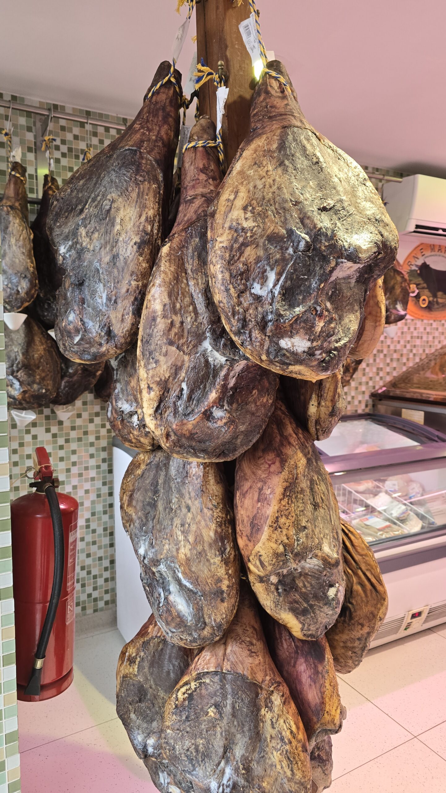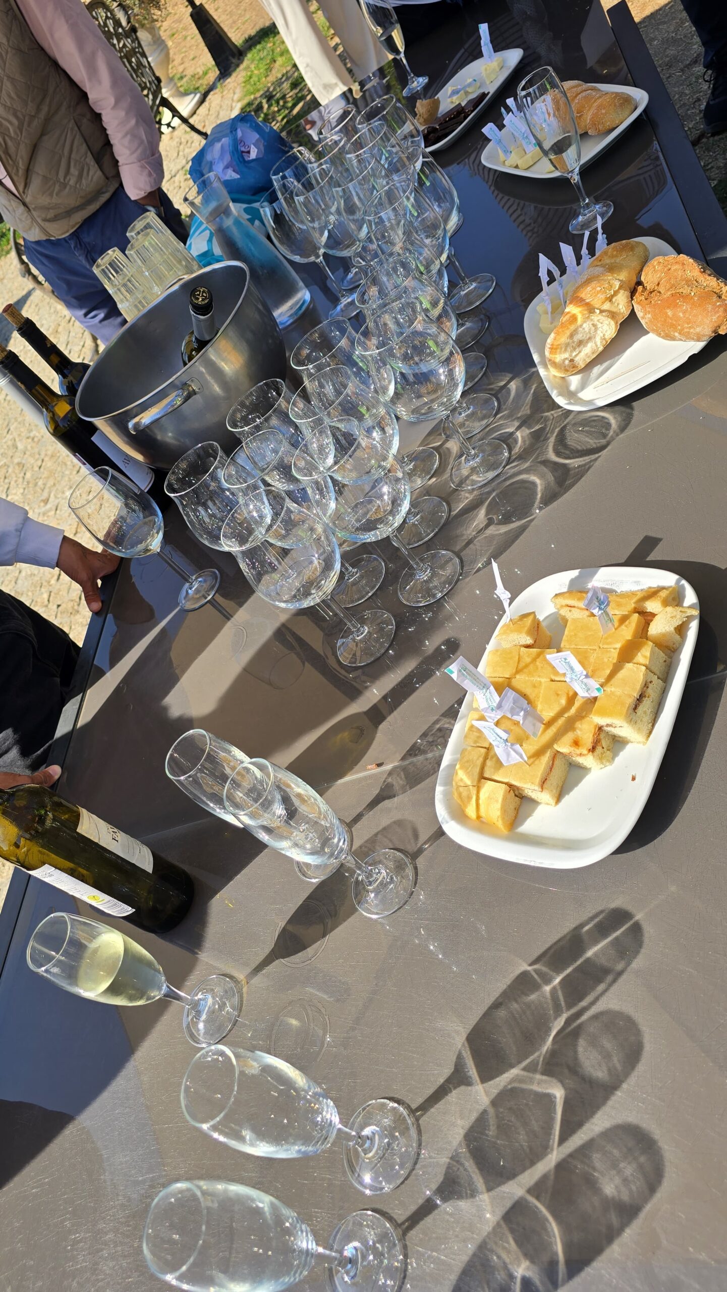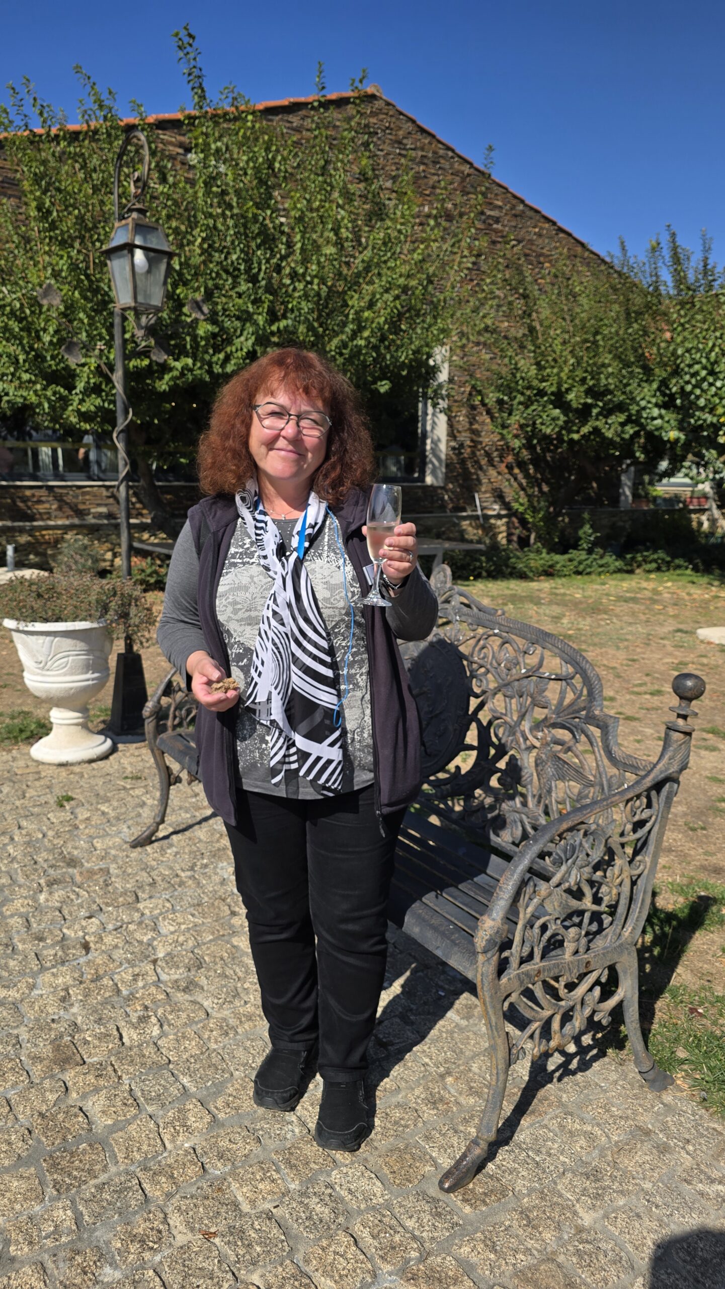 Ein Familienbetrieb, Gabriel wird uns führen, doch zuvor müssen wir schließlich kosten, was sie hier produzieren. Wir beginnen mit einem Weißwein- naja, steigerungsfähig für unsere Kenner (HobbyKelterer), dann folgen ein Roter und ein Rose. Gut, dass ich für einen kleinen Imbiss gesorgt hatte. Das Ambiente ist umwerfend, Sitzgelegenheiten unter der Pergola, Schaukeln, Aussichten ins Tal, Rosen und Reben, soweit das Auge reicht… Dann zeigt uns Gabriel das Anwesen und wir kommen gerade noch rechtzeitig. Die Ernte ist nämlich abgeschlossen und die letzten Trauben werden vergoren. Das passiert hier tatsächlich noch traditionell mit dem Füssen- die Trauben werden gestampft. Gabriel erzählt, dass nur der Mensch es schafft, dass beim Stampfen nicht die Kerne und Schalen zerstört werden, wie es eine automatische Presse unweigerlich tun würde. So vermeiden sie Bitterstoffe der Kerne und können einen exzellenten Wein herstellen. Von den Traubenbecken geht es zu den Fasslagern, und da gibt es tatsächlich noch Fässer der Großeltern-Generation, die nur für Ostern und besondere Gelegenheiten (auch für Versteigerungen für caritative Zwecke) abgefüllt werden. Und hier geht die Verkostung weiter 🙂 Natürlich können wir die eine oder andere Flasche erstehen und dann geht es die Serpentinen wieder hinunter. Immerhin waren wir auf über 600 Meter.