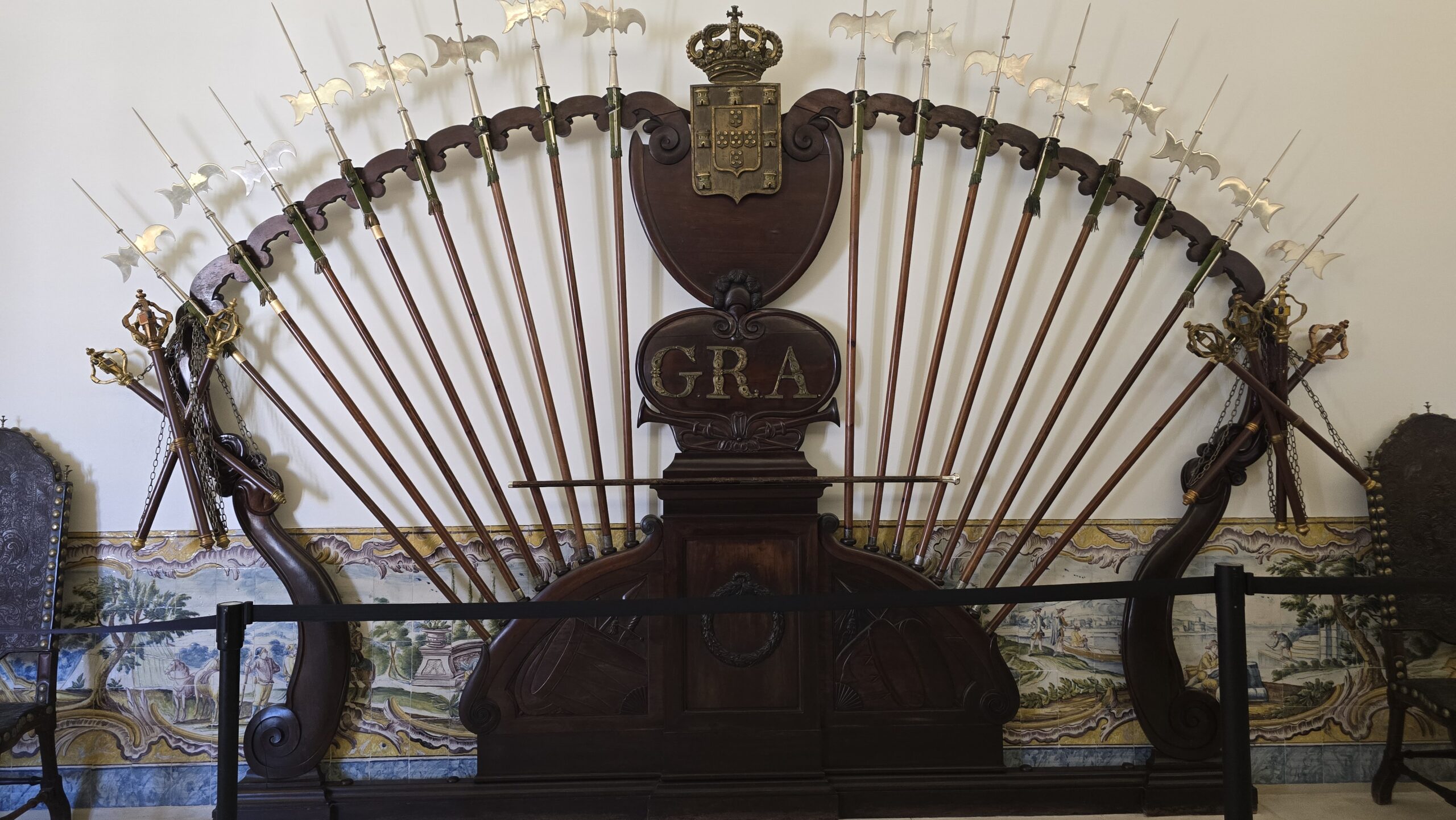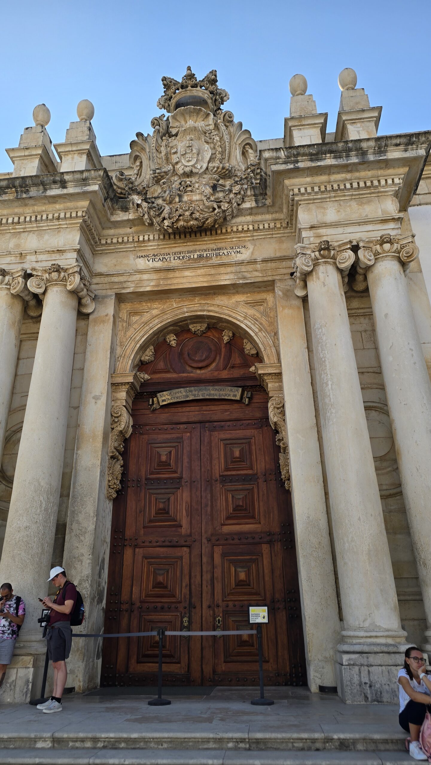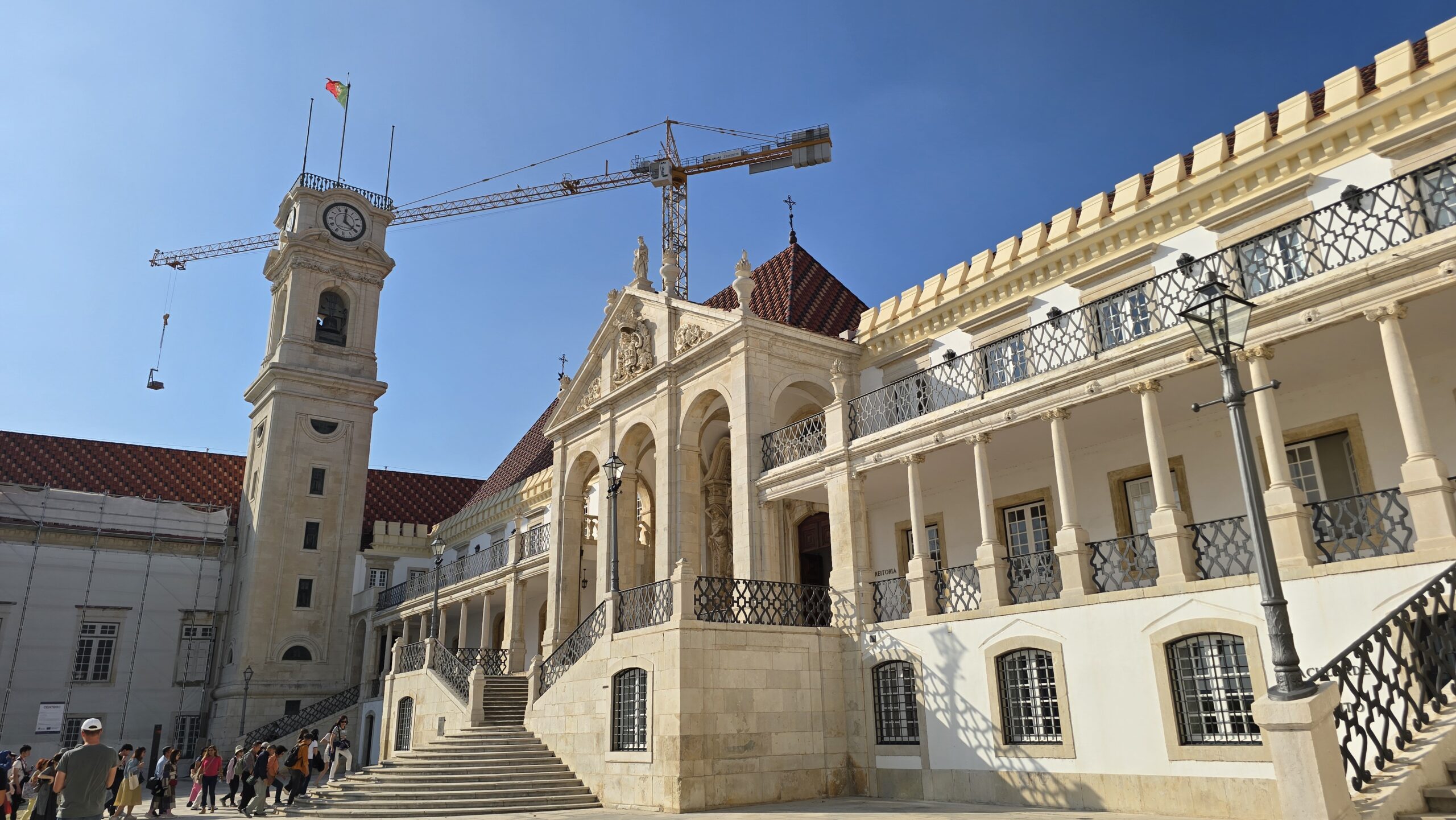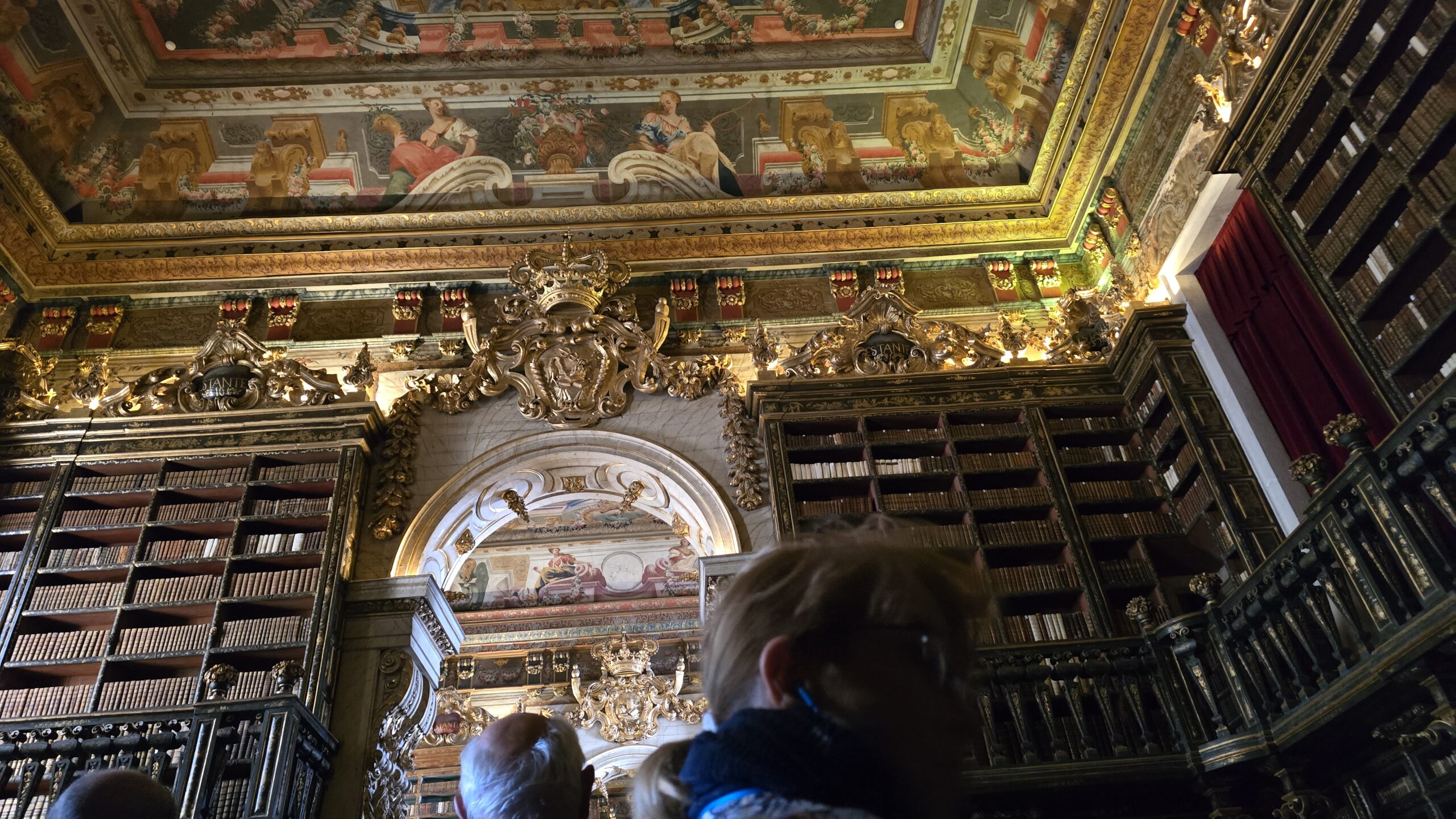Der Bushalt am Hotel Astoria ist perfekt gelegen, sofort ist man am Lago da Portugem und auf einer der schönen Gassen und Straßen. Wir haben Zeit für eine Mittagspause, staunen über riesige Baisser in den Auslagen, entscheiden uns dann aber doch lieber für eine kleine Mittagsmahlzeit. Basilio wartet mit dem Bus auf uns und fährt uns dann zur Universität hinauf, durch engste Kurven und steile Anstiege. Gut, dass er so erfahren und versiert ist. Pünktlich sind wir vor Ort, spazieren an den Unigebäuden vorbei, Luis erzählt uns, warum der Turm hier die „Ziege“ genannt wird: er regelte das Leben der Studenten. Sie wohnten außerhalb der Universitätsgebäude und der Turm kündete den Lernbeginn an und nach dem Läuten abends hatten Studenten nichts mehr auf den Straßen zu suchen…Unser Ziel ist aber die berühmte Bibliothek. Mehr als 50.000 Bände lagern hier in Räumen, ausgekleidet mit von Gold überzogenem Ebenholz, vergoldeten Wappen und Kronen über jedem Portal. Wir erfahren, dass sogar Fledermäuse hier gehalten werden. Sie vernichten die Insekten und sorgen so dafür, dass den Büchern nichts geschieht. Wir sind beeindruckt und folgen Luis auf einem Rundgang durch die Hallen und Gänge, die der König D. João III. der Universität überlassen hatte. Der Prunksaal ist ein Highlight, ebenso eine Ausstellung mit der Rekonstruktion des Gesichtes von König Dinis. Und auch hier überall Azulejos. Fotos vom Universitätsplatz folgen und dann spazieren wir zur Kathedrale. Sie stammt tatsächlich aus der Gründungszeit Portugals und wir staunen, dass diese Größe und Höhe im romanischen Baustil möglich waren. Dann spazieren wir weiter durch die Gassen und „Studentenrepubliken“, bewundern eine „portugiesische Gitarre“ am Stadttor und erreichen schließlich die Kirche de Santa Cruz. Überall treffen wir auf die neuen Studenten, die von älteren Semestern für allerlei „lustige“ Spielchen durch die Stadt gescheucht werden. Basilio wartet mit dem Bus auf uns und bringt uns zu unserem Hotel Vila Gale. Ein edles Ambiete zum Abendessen verwöhnt uns und dann verabschieden wir uns- bis morgen.