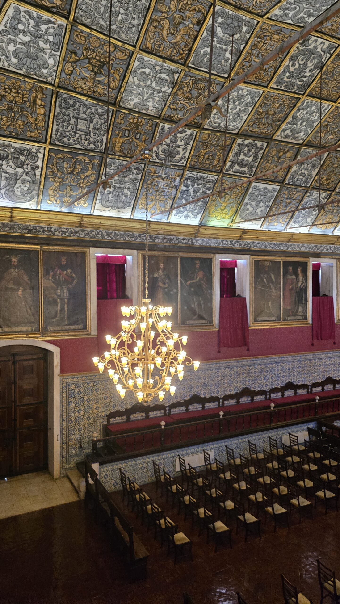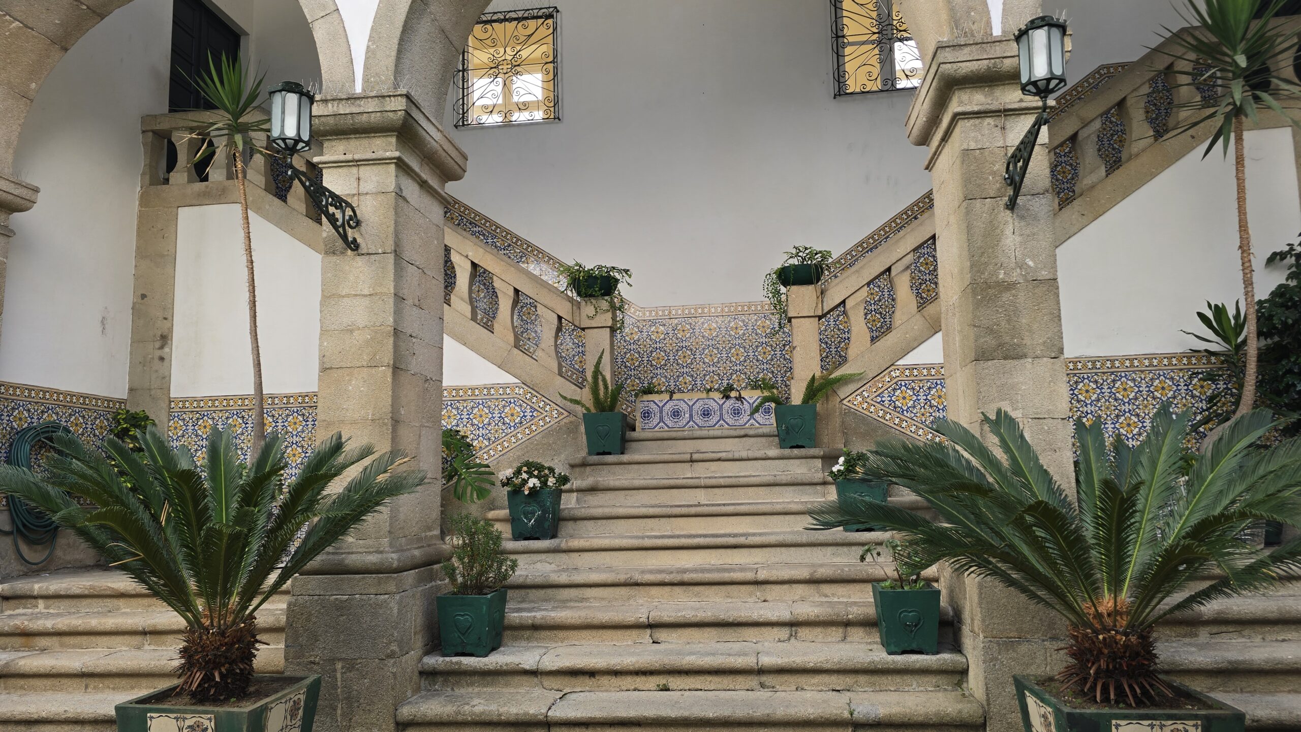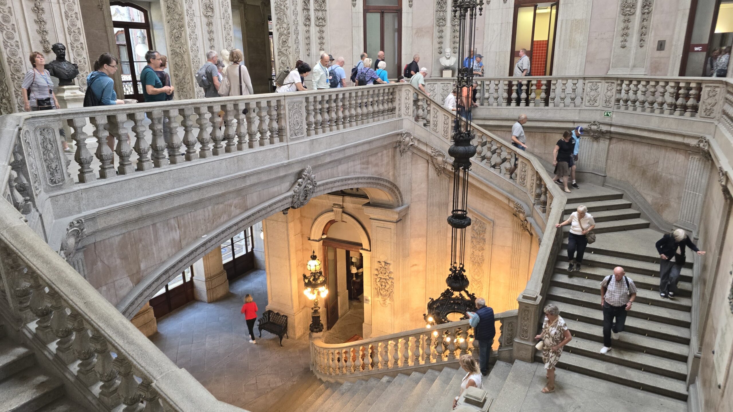 von der Handelskammer der Stadt Porto wurde es im 19. Jahrhundert als Handelsgericht und Börse errichtet. Heute wird das Gebäude oft für Konferenzen u.ä. genutzt, wir schauen uns um- die mächtige Kuppelhalle bezaubert, ihr Glasdach läßt den Innenhof lichtdurchflutet anmuten. Luis erzählt uns Geschichten zu den einzelnen Räumen, die Gerichtsräume, den Arbeitsraum von Gustave Eiffel, der hier die Eisenbahnbrücke konzipierte und bauen ließ, Repräsentationsräume und schließlich den Salao arabe, den arabischen Saal. Was für eine Kunstfertigkeit. Das hatte niemand hier so erwartet. Über die große Treppe gelangen wir nach unten und können noch erleben, wie die riesigen Kronleuchter des Eingangsportals nach unten gelassen werden. Das sieht man auch nicht jeden Tag. Unten passieren wir noch die Bibliothek und den Shop, dann spazieren wir weiter zum Fluss, zum Douro. Hier ist Zeit und viel Gelegenheit für eine Mittagspause.