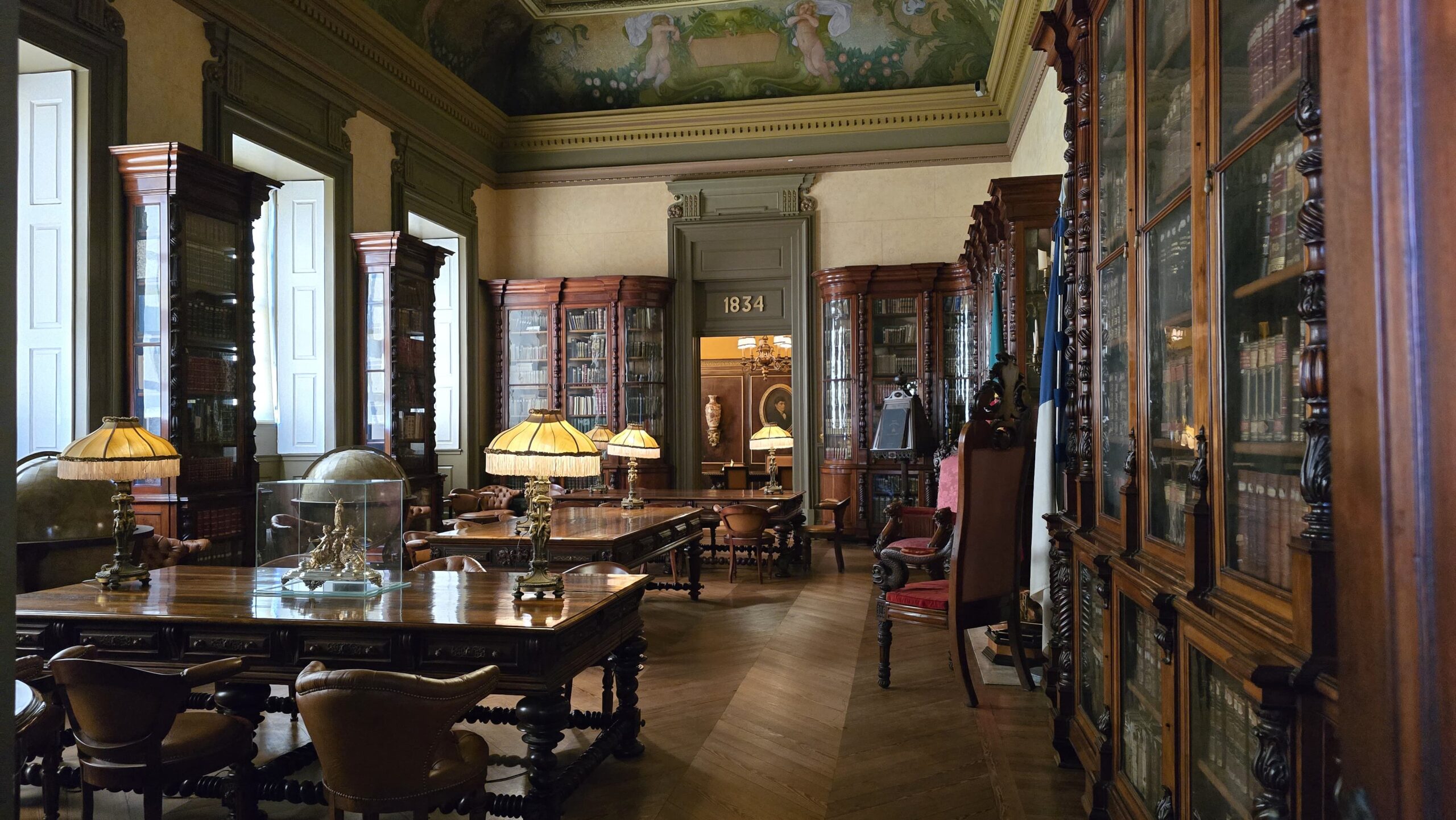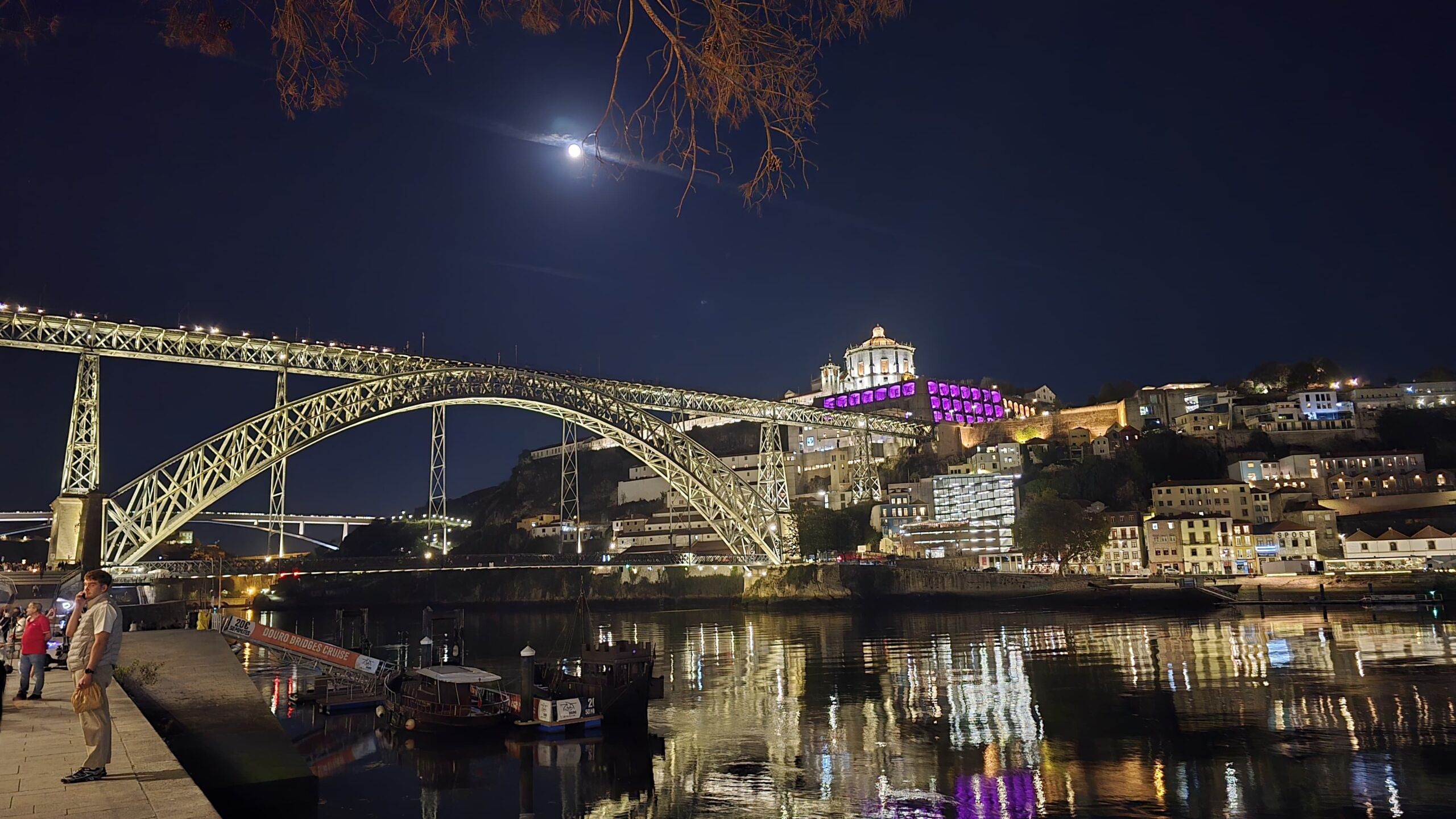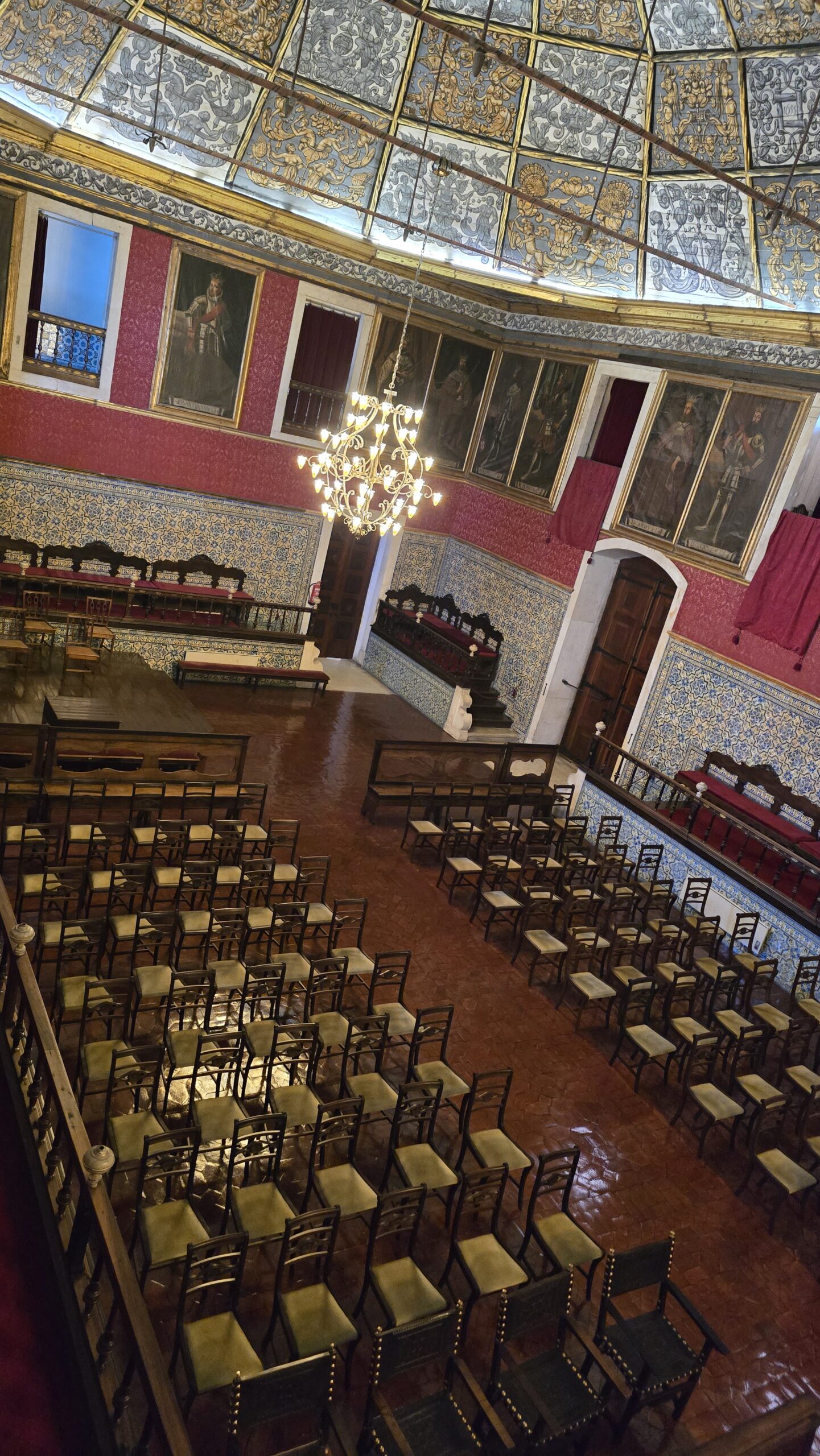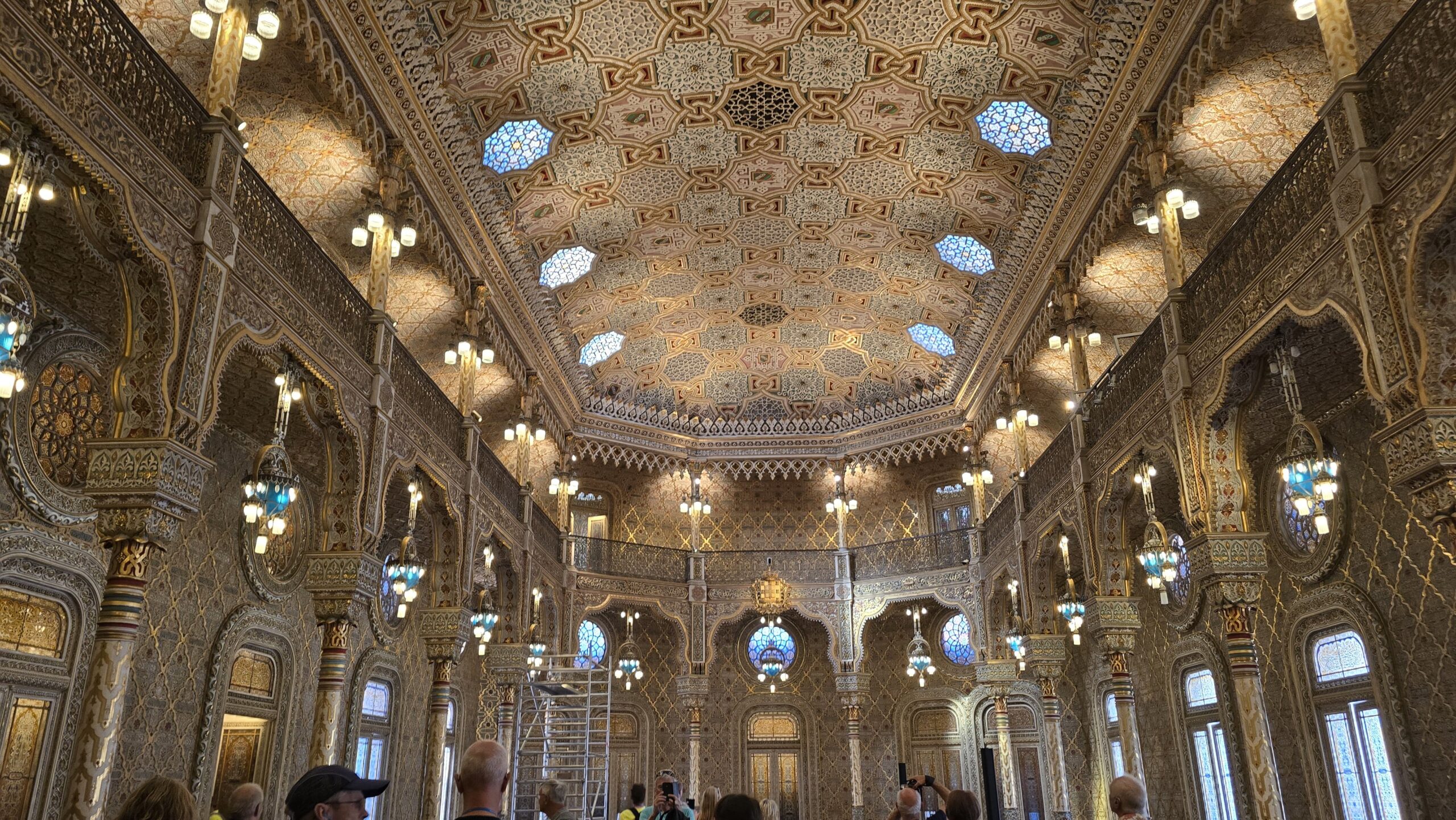 von der Handelskammer der Stadt Porto wurde es im 19. Jahrhundert als Handelsgericht und Börse errichtet. Heute wird das Gebäude oft für Konferenzen u.ä. genutzt, wir schauen uns um- die mächtige Kuppelhalle bezaubert, ihr Glasdach läßt den Innenhof lichtdurchflutet anmuten. Luis erzählt uns Geschichten zu den einzelnen Räumen, die Gerichtsräume, den Arbeitsraum von Gustave Eiffel, der hier die Eisenbahnbrücke konzipierte und bauen ließ, Repräsentationsräume und schließlich den Salao arabe, den arabischen Saal. Was für eine Kunstfertigkeit. Das hatte niemand hier so erwartet. Über die große Treppe gelangen wir nach unten und können noch erleben, wie die riesigen Kronleuchter des Eingangsportals nach unten gelassen werden. Das sieht man auch nicht jeden Tag. Unten passieren wir noch die Bibliothek und den Shop, dann spazieren wir weiter zum Fluss, zum Douro. Hier ist Zeit und viel Gelegenheit für eine Mittagspause.