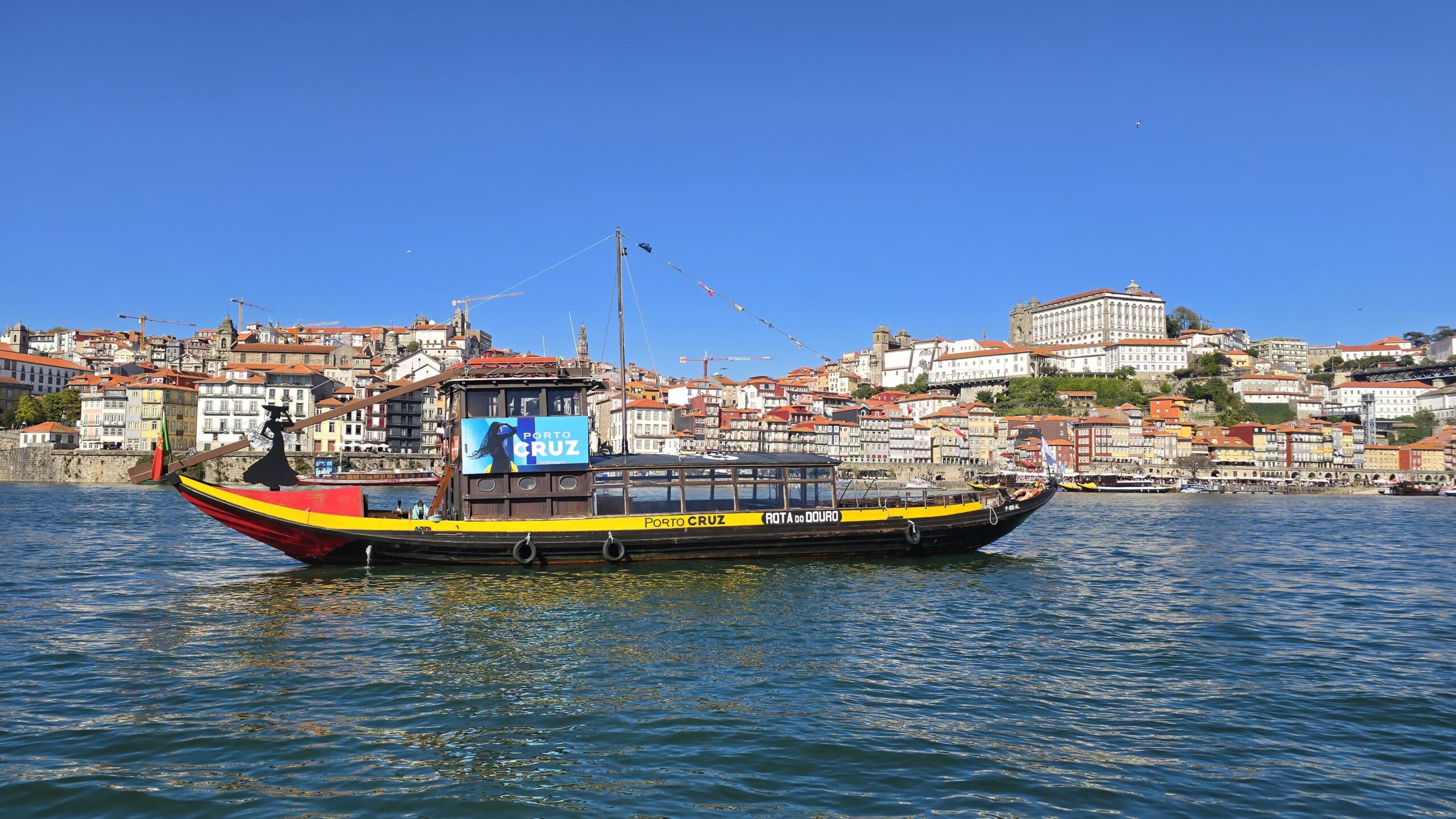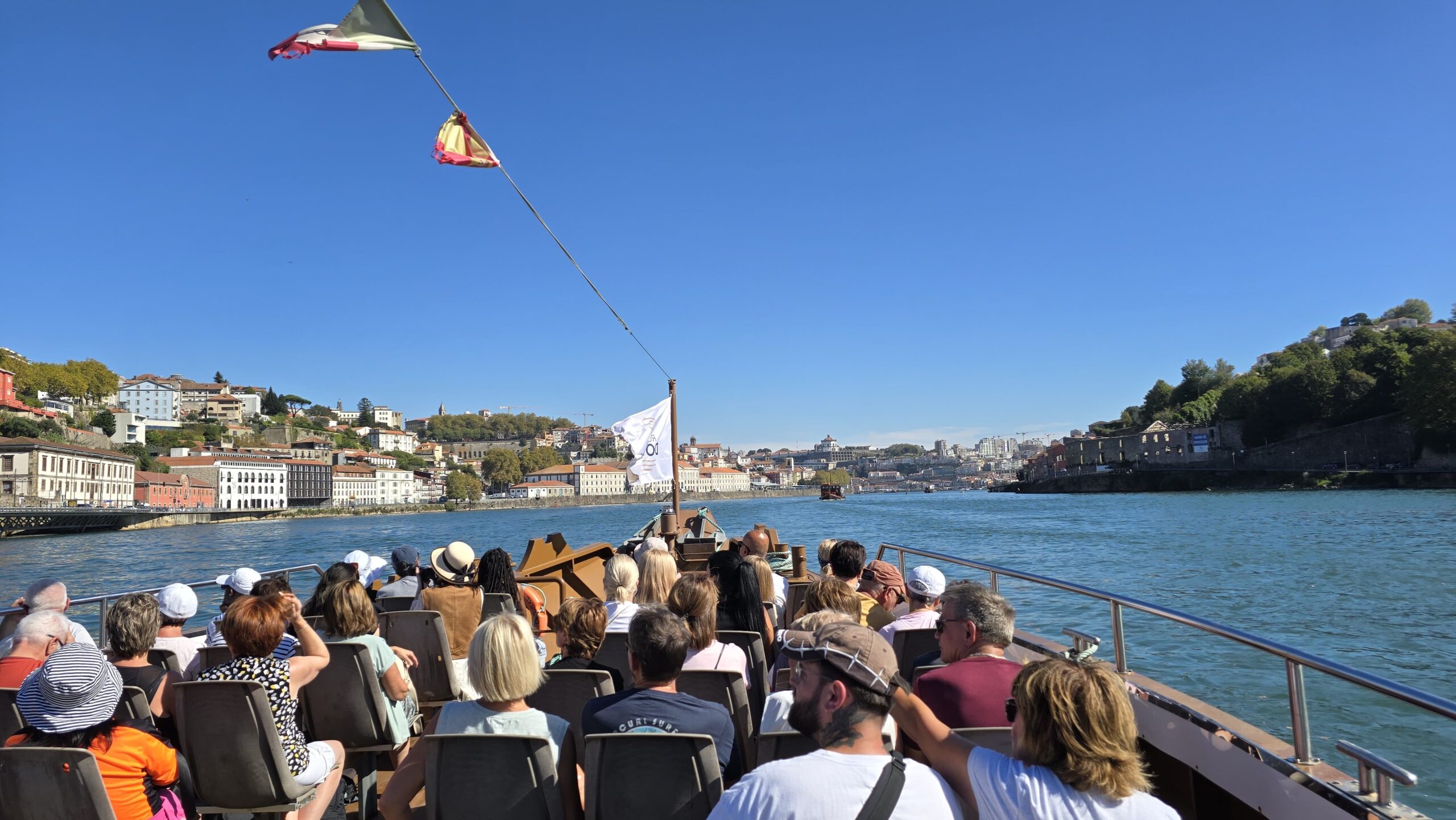 Unweit von hier ist die Anlegestelle für unser Boot, mit dem wir heute noch eine Fahrt auf dem Douro unternehmen wollen, also treffen wir uns gleich wieder hier. Da kommt auch schon unser Boot: Alle suchen Platz unter dem Sonnendach, es sind um die 28 °C, die Sonne ist erbarmungslos, läßt aber alles ringsumher strahlen und leuchten. Dann genießen wir die Fahrt, erst flussabwärts unter den berühmten Brücken von Eiffel und seinen Schülern hindurch, später flussaufwärts Richtung Mündung des Douro in den Atlantik. Am Ufer liegen die alten Robeiro-Boote, mit denen früher der Portwein aus den ca. 100 Kilometer entfernten Anbaugebieten am Douro her transportiert wurden. Am anderen Ufer des Douro ist Gaia, hier befinden sich die Weinkellereien, die diesen typischen Wein für Porto- den Portwein- herstellen. Unübersehbar die Werbefiguren, am bekanntesten wohl die von Sandemann. Hier, auf der Gaia-Seite steigen wir auch aus, Basilio wartet bereits mit seinem Bus auf uns. Er bringt uns zu einer