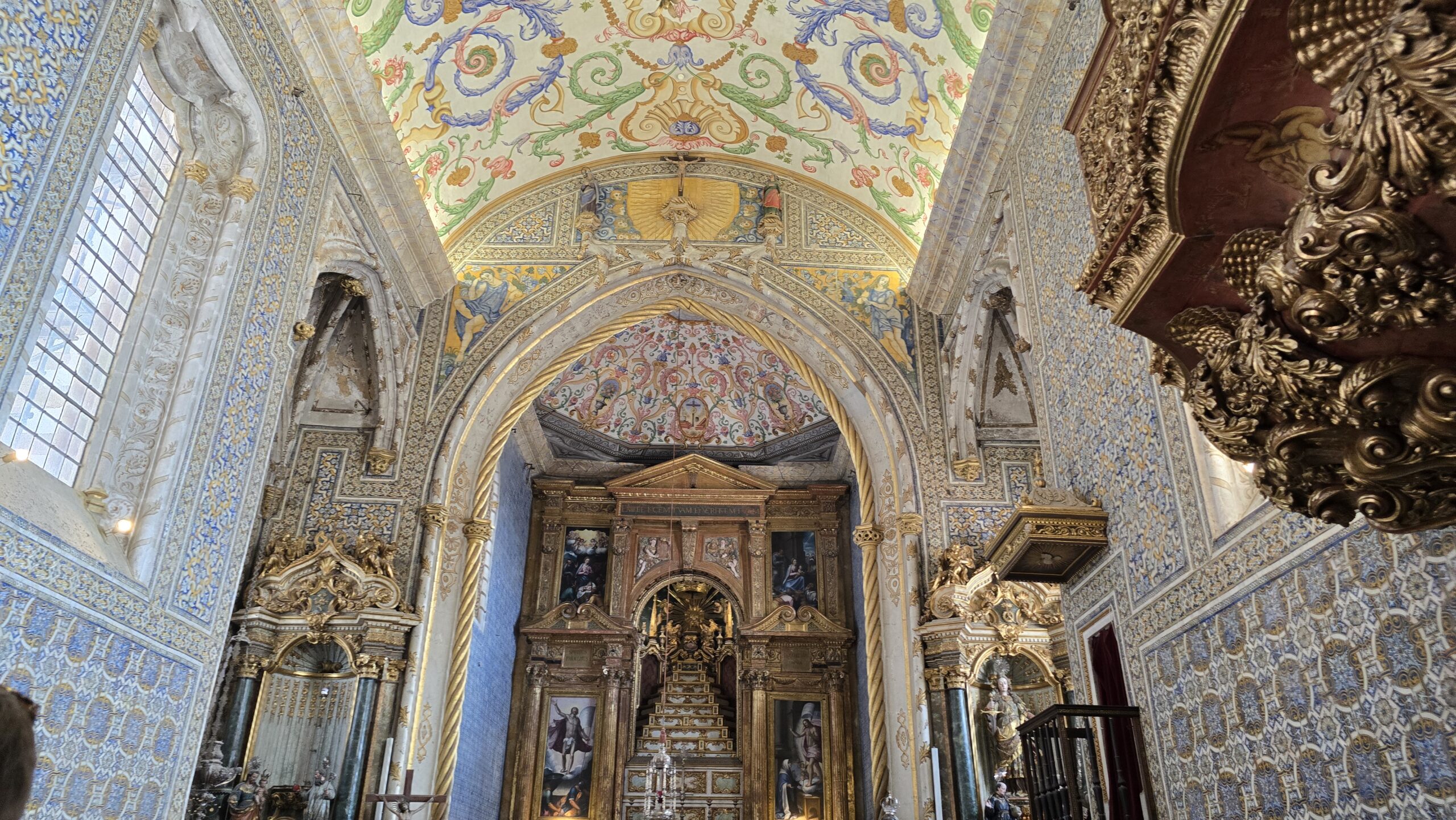 hatten wir bald erreicht und steigen an der Stadtmauer aus. Hier treffen wir auf römische Zeitzeugen- den römischen Tempel. Es ist Zufall, dass er erhalten blieb. Er war nämlich quasi eingemauert in dem Schlachthof, der hier einmal stand. Jetzt sind die Säulen wieder freigelegt und eine der Sehenswürdigkeiten von Evora, der Hauptstadt des Alentejo. Eine weitere ist ihre Kathedrale. Sie empfängt uns mit einem wunderschönen gotischen Portal. Im Inneren dann eine der seltenen Darstellungen der schwangeren Jungfrau Maria. Die barocke Ausgestaltung der Kirche ist überwältigend und man könnte stundenlang hier verweilen und doch immer wieder etwas Neues entdecken. Einige wagen sich dann mit Luis hinauf, andere bleiben in den Säulengängen und bewundern das einfallende Licht der Sonne, das nochmals durch Buntglas golden erscheint. Wir spazieren weiter durch die Gassen der Stadt, die schon immer bedeutender Handelspunkt war und auf dem Marktplatz schließlich trennen wir uns kurz, jeder hat individuell Zeit, die Stadt weiter zu erkunden oder einen Mittagsimbiss zu sich zu nehmen. Durch die Gassen geht es zu den Gärten von Evora mit ihren Pfauen. Am anderen Ende der Stadtmauer wartet Basilio mit dem Bus und wir können Richtung Süden aufbrechen.