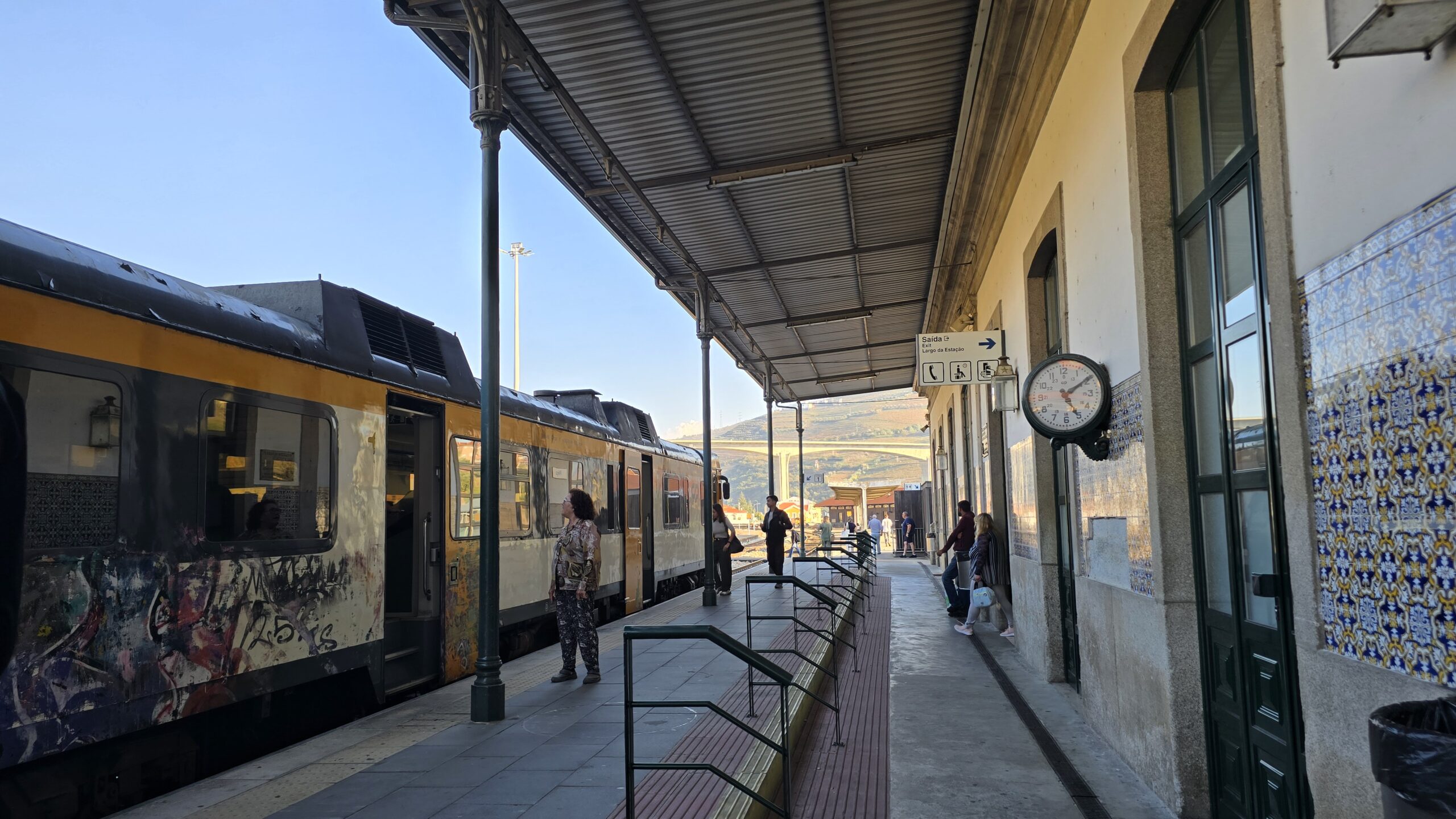 Hier verbringen wir unsere Mittagspause und fahren dann mit der Bahn nach Regua. Wir laufen hinunter zum Fluss, was für ein schöner Ort, direkt am Fluss, die Berge erheben sich dahinter, Flusskreuzfahrtschiffe schieben sich behäbig den Fluss entlang. Allerdings erleben einige beim Mittagsimbiss übelste Touristen-Abzocke, viel mehr hat der Ort zu dieser Jahreszeit leider auch nicht als Mittagsimbiss zu bieten…Der Bahnhof aber ist überaus schön und reich mit Azulejos geschmückt, das sind die Kachelfliessen. Hier stellen sie das Leben auf dem Land dar, schön kann man die Trachten und die Arbeiten hier nachvollziehen. Mit ein wenig Verspätung kommt dann auch endlich unsere Bahn und gemütlich fahren wir am Douro entlang.