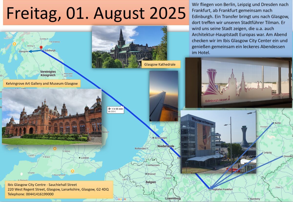 Wie immer geht es für die “ Zubringer- Flüge“ mehr als zeitig los. Wir starten in Berlin, Leipzig und Dresden. In Frankfurt treffen wir uns und fliegen gemeinsam nach Edinburgh. Passkontrolle und Kofferausgabe verlaufen zügig und schon sind wir auf dem Weg zu unserem Bus. Mike empfängt uns, verstaut die Koffer und los geht’s nach Glasgow. Die größte Stadt Schottland wollen wir kennenlernen und hier hilft uns Til.