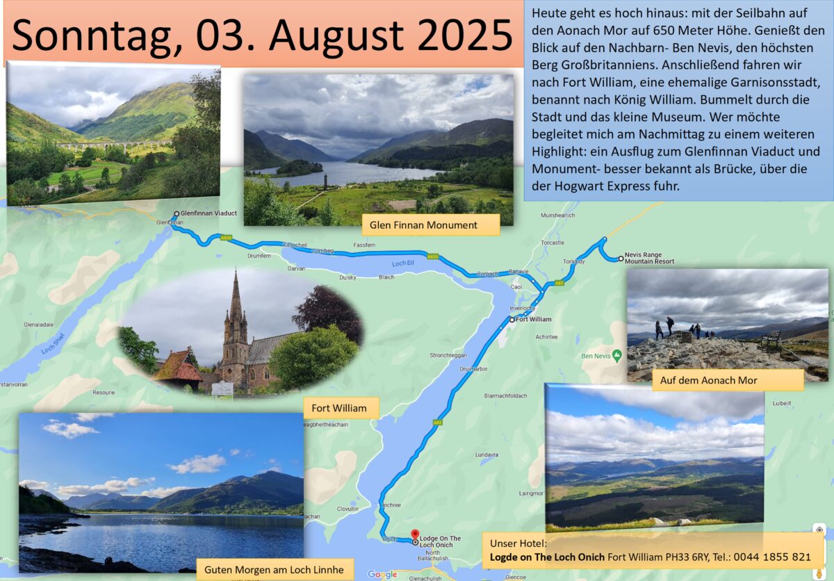 Heute erobern wir den achthöchsten Berg Schottlands- den Aonach Mor. Und das auf die bequemste Art, die es gibt- mit der Seilbahn. In 6er-Gondeln geht es hinauf auf 640 Meter. Von hier aus spazieren wir gemeinsam zum Aussichtspunkt, die Regenwolken haben sich verzogen und wir haben einen wunderschönen Blick auf die Täler und Berge. In der höchstgelegenen Cafeteria Schottlands genießen viele einen Kaffee oder Tee bevor es wieder hinunter geht mit der Seilbahn.