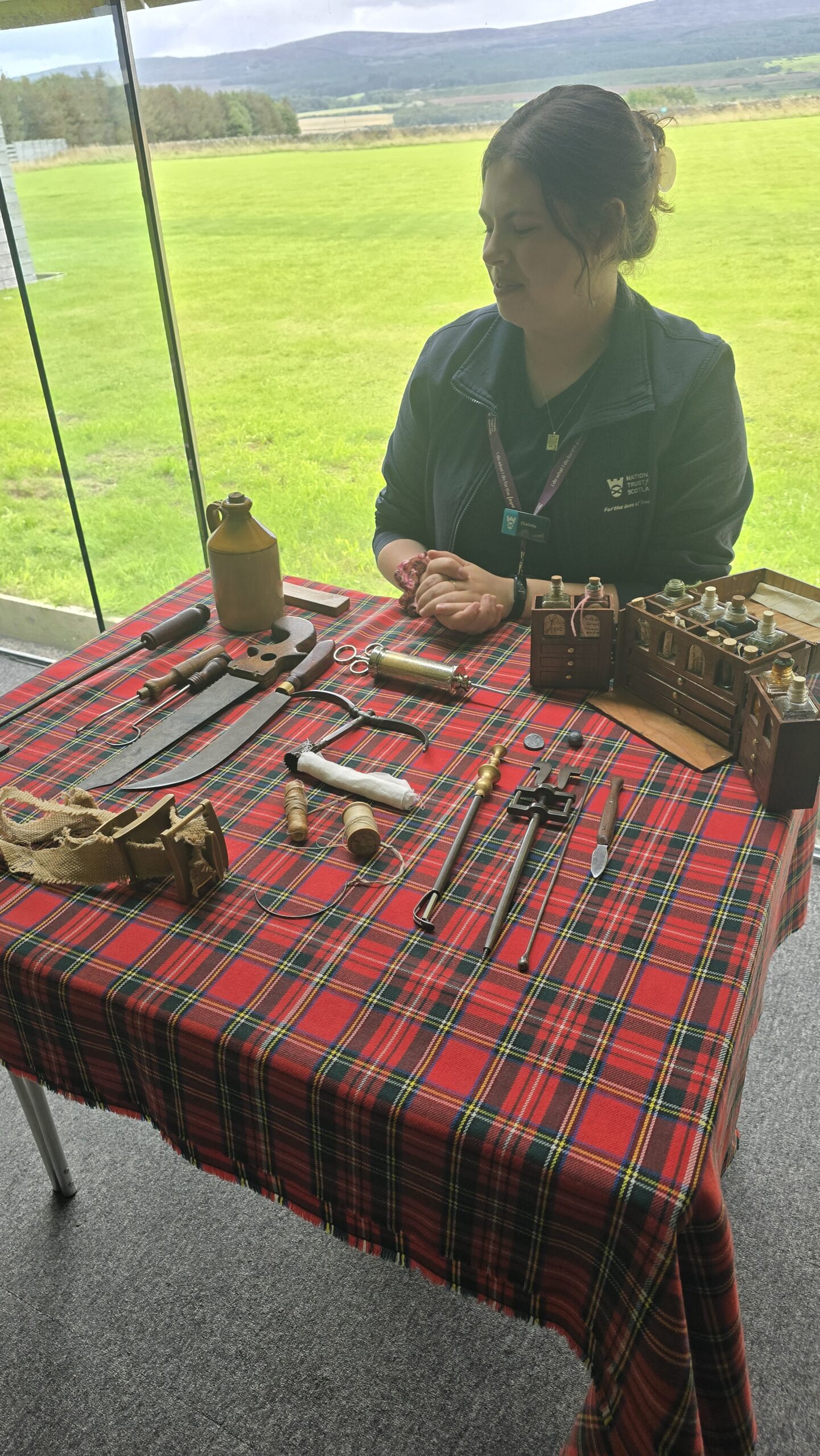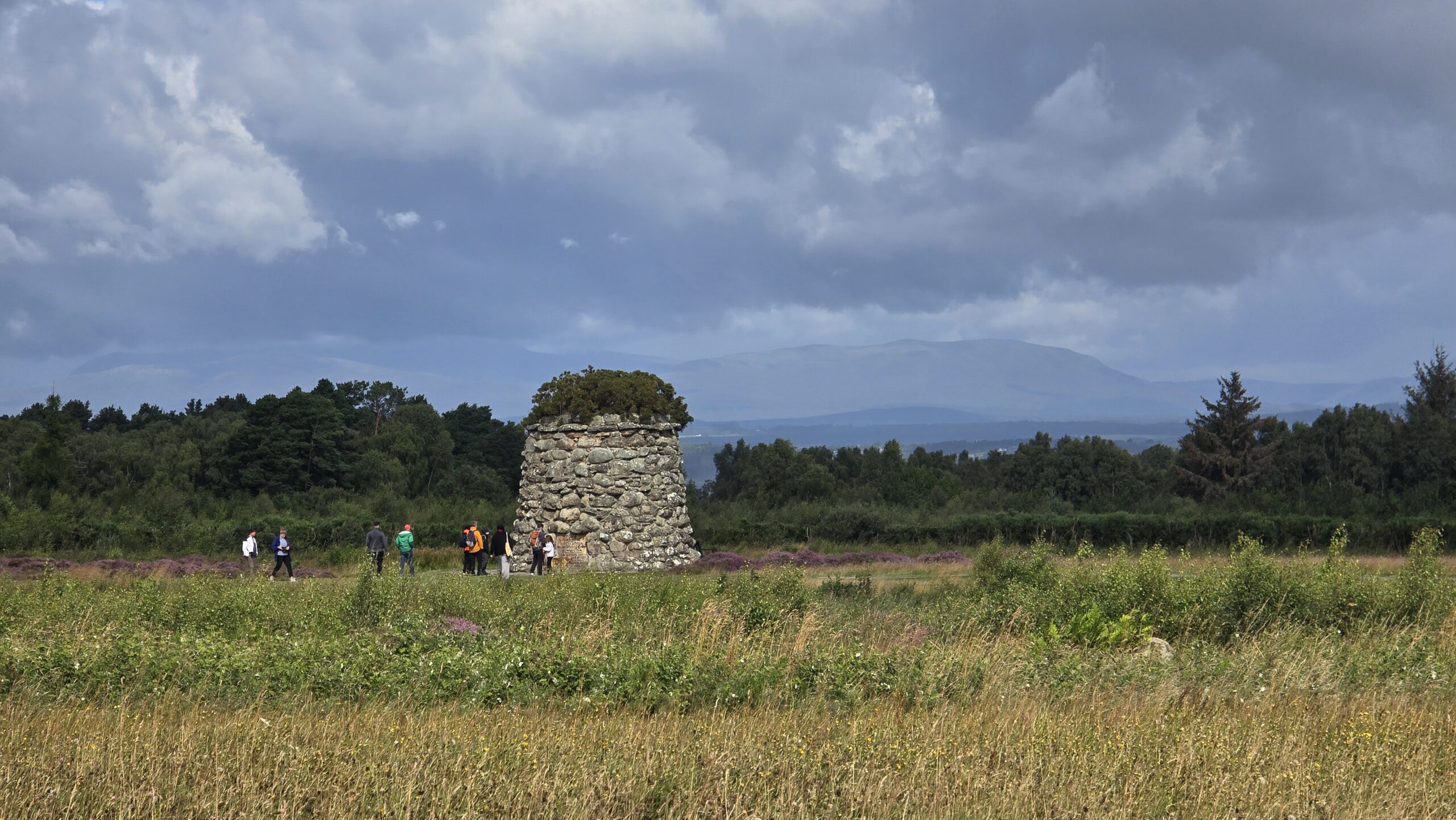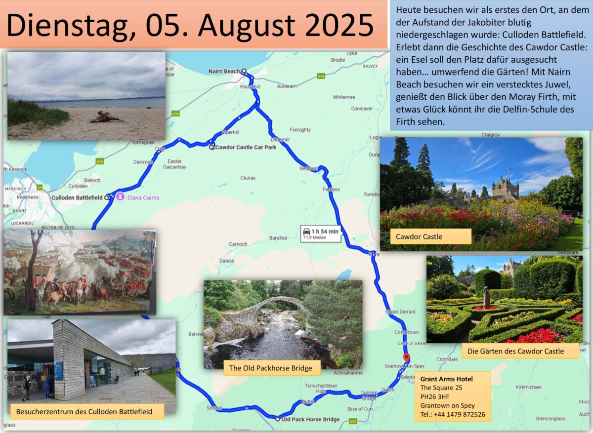 Das Frühstück wird heute serviert- etwas gewöhnungsbedürftig, aber es klappt reibungslos. Gestärkt starten wir in den Tag und wieder Richtung Norden. Das Culloden Battlefield steht als erstes auf unserem Programm. Hier fand 1746 die entscheidende Schlacht zwischen stuarttreuen Jakobitern und der englischen Armee statt, die schließlich zur endgültigen Niederschlagung des Jakobiter-Aufstandes führte. Ausgerüstet mit Audio Guides erkunden wir in der Ausstellung viel sehens- und hörenswertes über die Zeit und den Aufstand. Auf dem ehemaligen Schlachtfeld zeigen rote und blaue Fahnen jerweils die Standorte der Armeen an, nicht mal eine Stunde soll das Gemetzel gedauert haben, der Aufstand war endgültig niedergeschlagen. Der Duke of Cumberland, der die englischen Truppen befehligte, befahl nun, alle Verwundeten zu töten, jeden Aufständischen und jeden Unterstützer. Seine Grausamkeit brachte ihm den Namen „The Butcher = der Schlachter“ ein. In der Folge wurden die Highland Clans entmachtet, Unterstützer verloren Land und Titel, viele auch ihr Leben. Der Kilt und der Dudelsack, alles, was Highland- Clans symbolisierte, wurde verboten. Heute erinnern Steine mit den Namen der Clans an die Stellen, wo deren Angehörige begraben worden waren. Besonderer Anziehungspunkt selbstverständlich der Stein der Frasers.