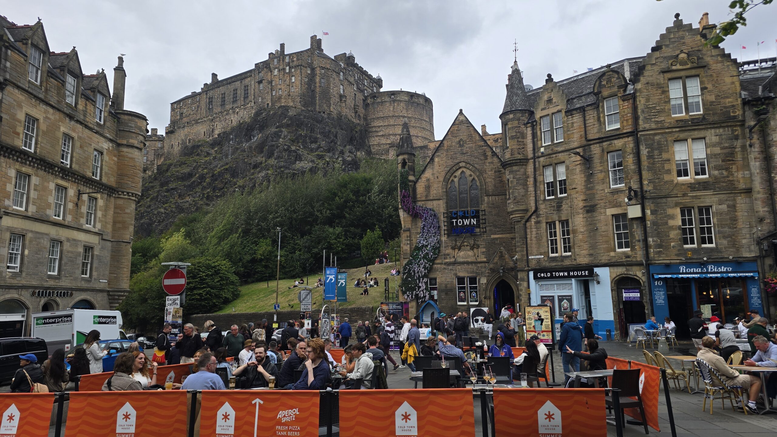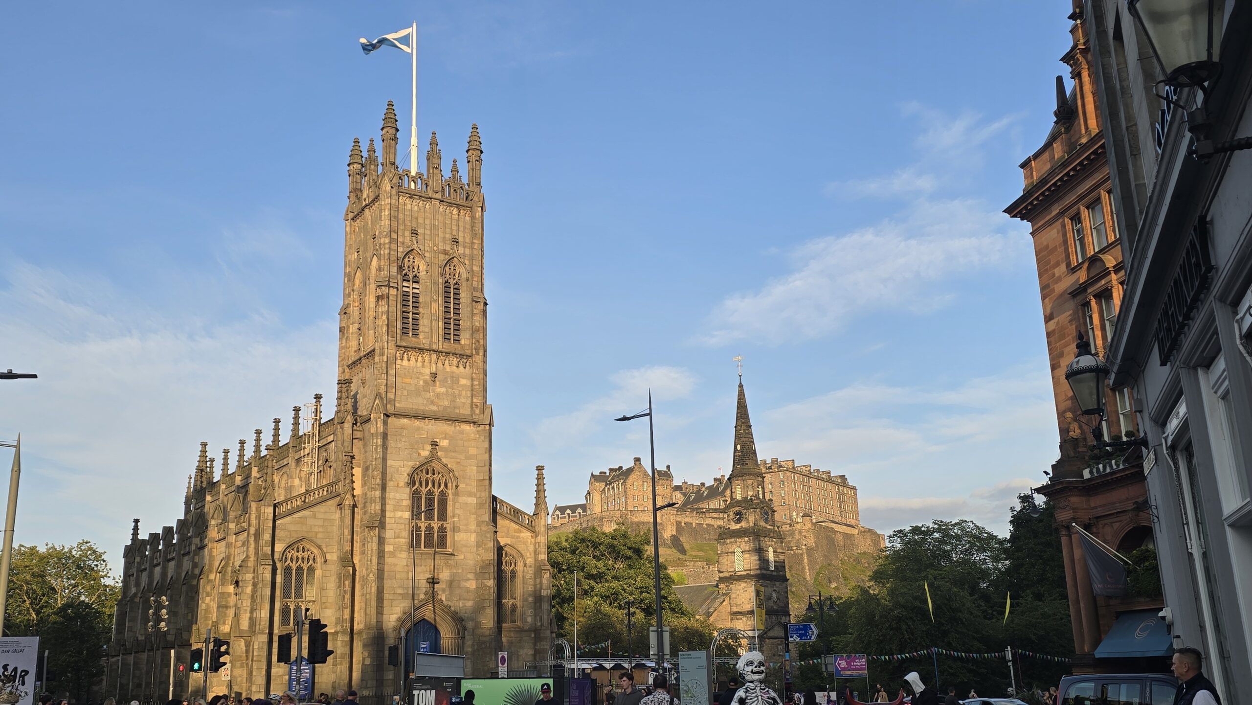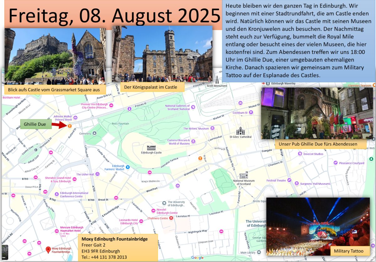 Ein individuelles Frühstück läßt uns gut in den Tag starten, dann treffen wir uns mit Lydia im Foyer unseres Hotels. Sie ist unsere Stadtführerin für Edinburgh und auch unser Fahrer Ross kommt mit einem Bus zu uns. Los geht es durch die Neustadt, die ebenfalls wie die Altstadt Weltkulturerbe der UNESCO ist, wir besuchen den Charlotte Square, Lydia zeigt uns den Pub, in dem wir heute Abend essen werden, spazieren den Calton Hill hinauf und genießen den Blick auf die Stadt und das Umland. Wir sehen Holyrood Palace, den Sitz des Königs, wenn er in der Stadt ist und das schottische Parlament- ziemlich gewagte Architektur direkt gegenüber dem Palast. Die Royal Mile geht es hinauf bis zu den Absperrungen, denn im August ist die Stadt fest in Händen der Straßenkünstler. Das Fringe, ein Festival, lockt mit mehr als 2500 Veranstaltungen, das Buchfestival und auch das Royal Military Tattoo. Ross fährt uns zum Burgberg. Unterhalb der Burg steigen wir aus und Lydia bringt uns zum Castle. Ich habe inzwischen die Tickets geholt und gemeinsam „erobern“ wir die Burg. Hören unterwegs viel Interessantes über die Geschichte des Castles und seiner Bewohner. Bis zu den Staatsgemächern und den Kronjuwelen bleiben wir zusammen, dann bedanken wir uns bei Lydia und verabschieden uns.