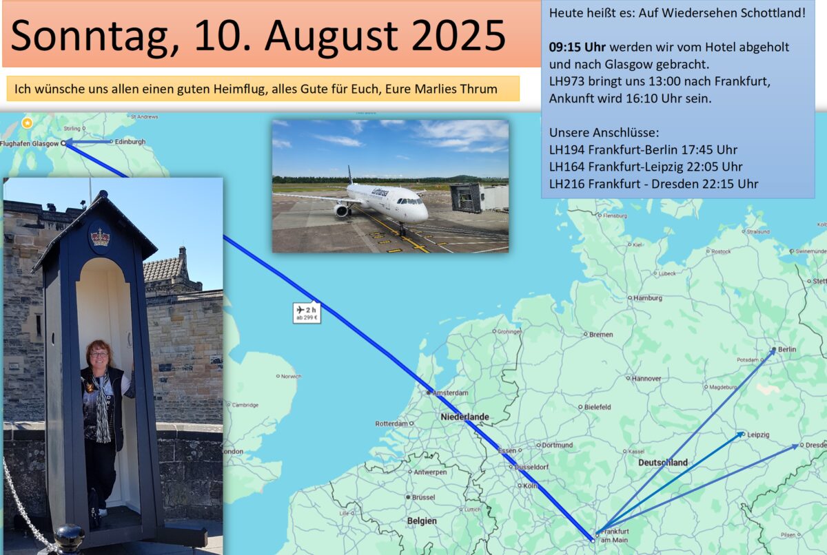 Schon am Morgen kommt unser Transfer zum Flughafen und wir fahren nach Glasgow. Leider war kein anderer Rückflug buchbar, also checken wir hier ein. Gemeinsam geht es nach Frankfurt und von dort für manche erst am späten Abend weiter. Berlin, Dresden und Leipzig werden avisiert und kurz vor Mitternacht kommen die letzten Gäste wohlbehalten an. Eine schöne Reise ist zu Ende und auch ich mache mich auf den Heimweg.