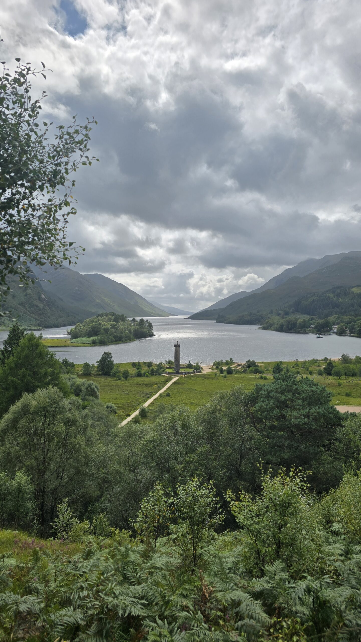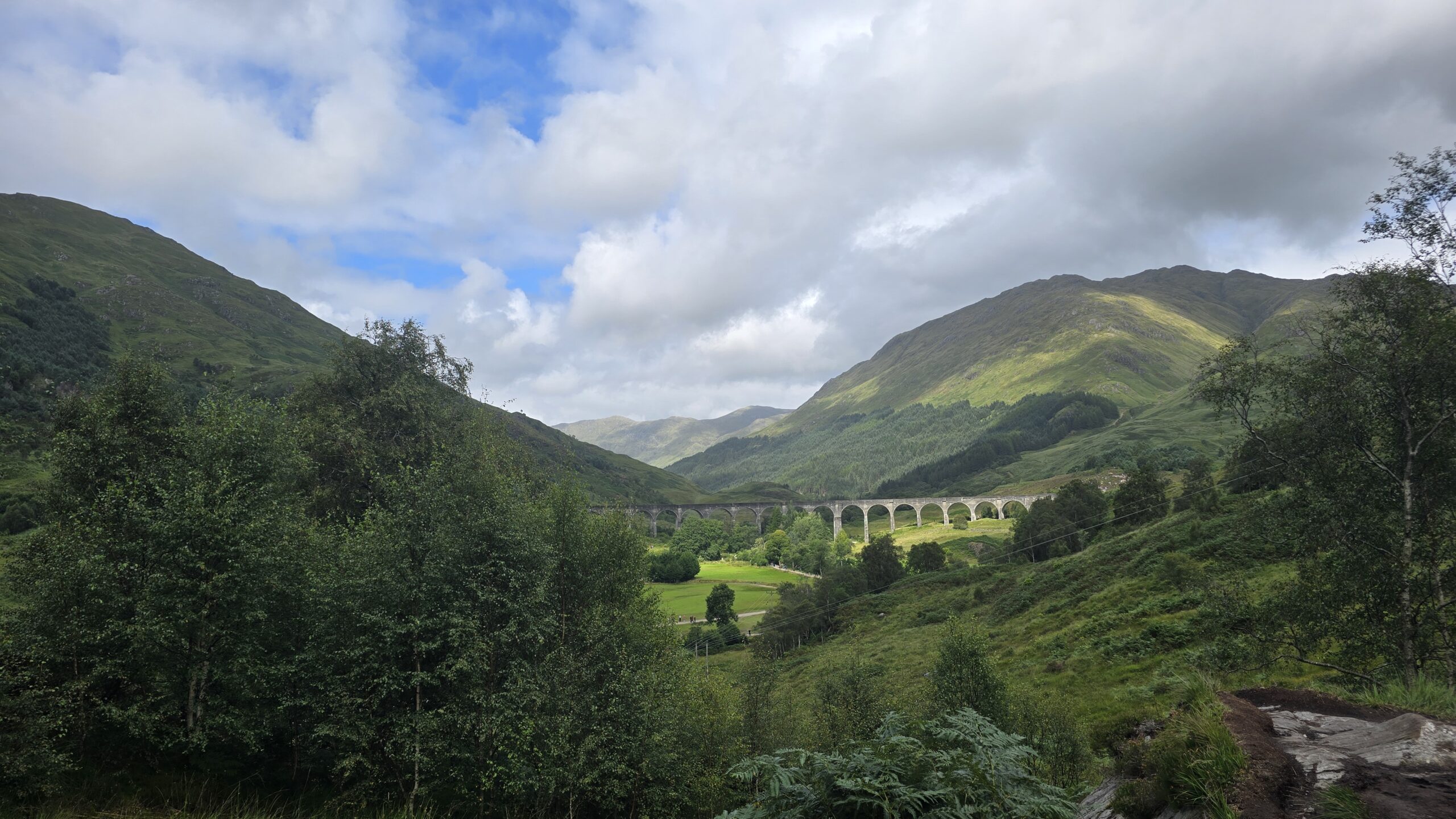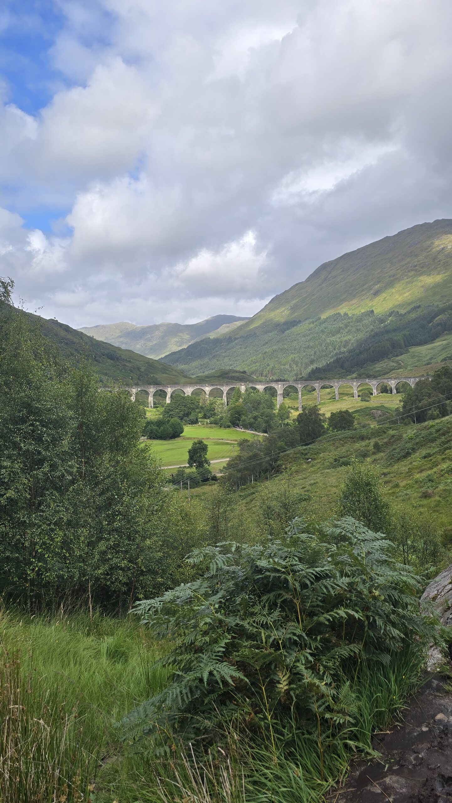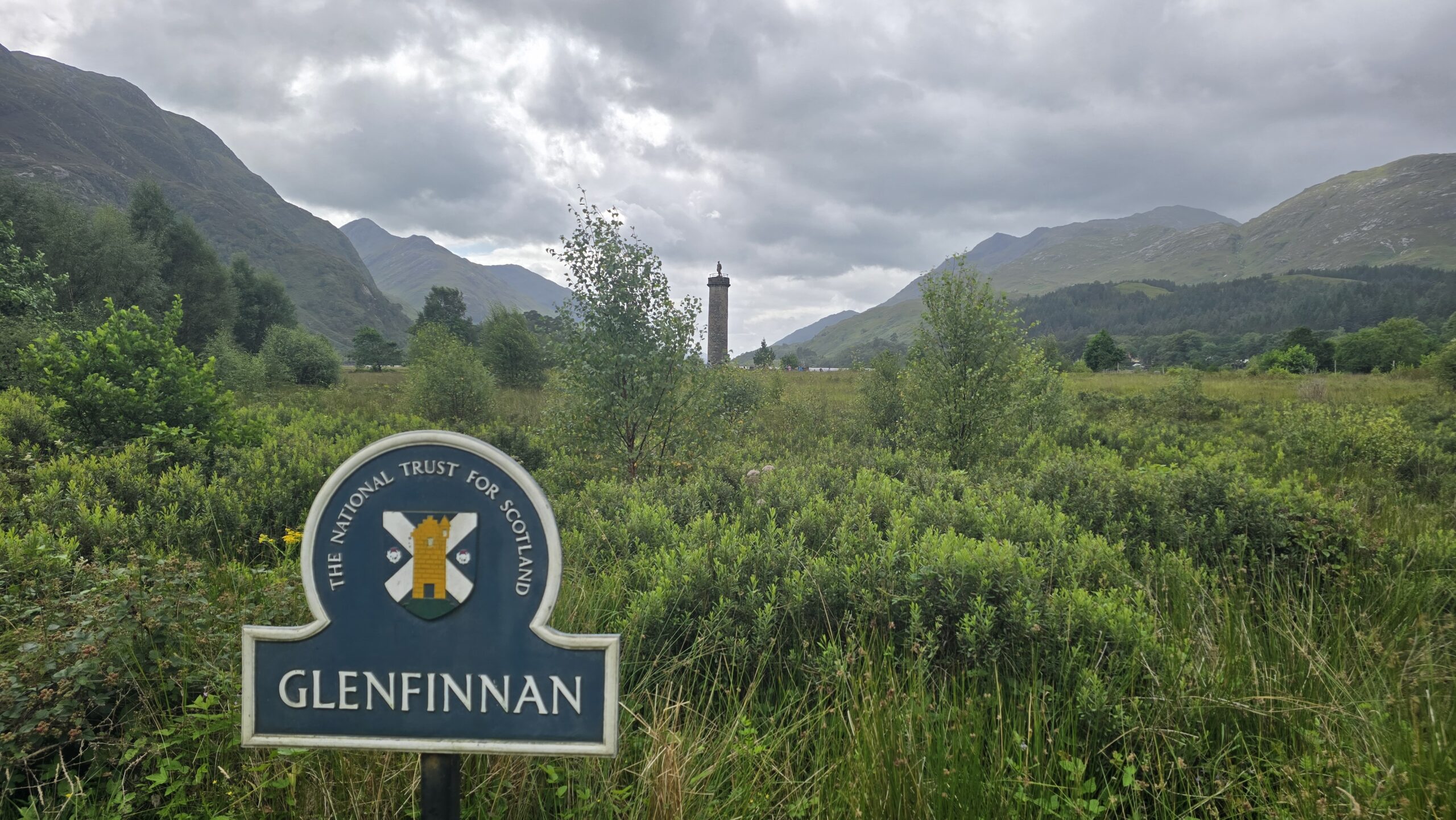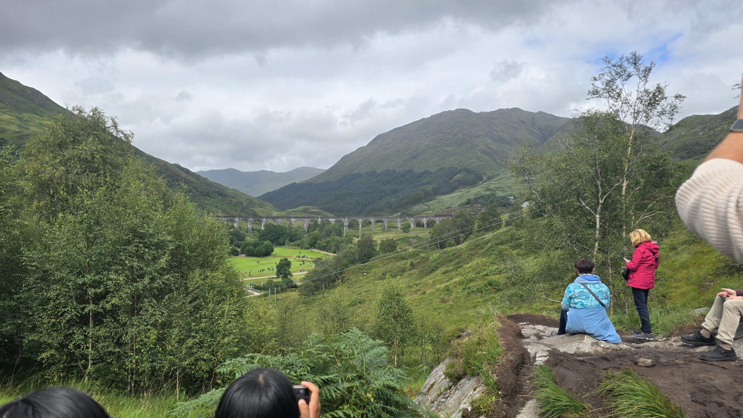 Zum Mittag geht es nach Fort William, eine Mittagspause oder ein ausgiebiger Besuch hier ist möglich, aber alle entschließen sich, meinem Vorschlag zu folgen und zum Glenfinnan Viaduct zu fahren. (Wenn wir schon mal hier sind…) Also geht es nach dem Lunch weiter, wir erwischen den letzten freien Busparkplatz und steigen gemeinsam hinauf zum Aussichtspunkt- auf das Viadukt, wo jede Minute der Jakobite Train hinüberfährt- besser bekannt als Hogwarts Express. Auch der hat mal Verspätung und so warten wir gelassen eine halbe Stunde. Werden dann aber belohnt mit dem Pfeifen der Dampflok und ihrem Rattern über die Brücke. Wer mochte sah sich anschließend auf den Monument um, ein toller Blick auf den Loch Shield inklusive.