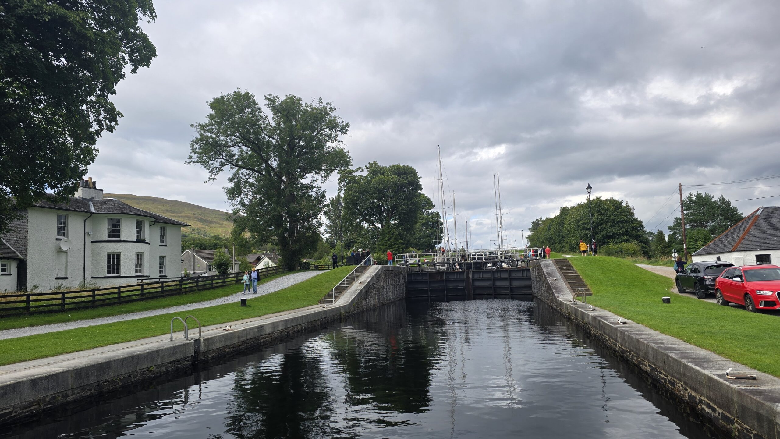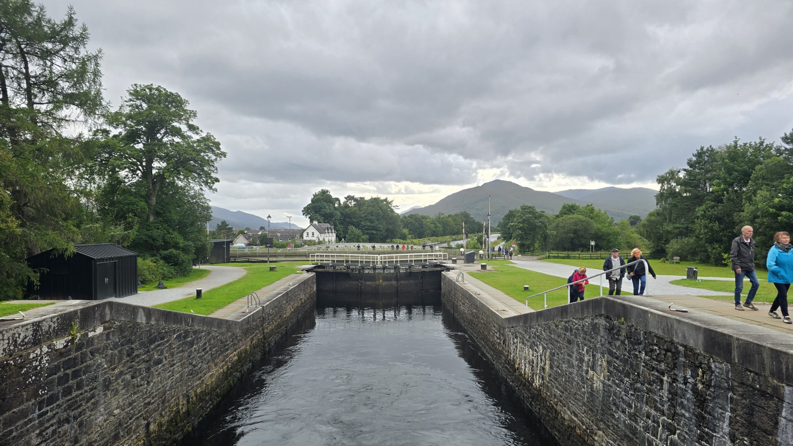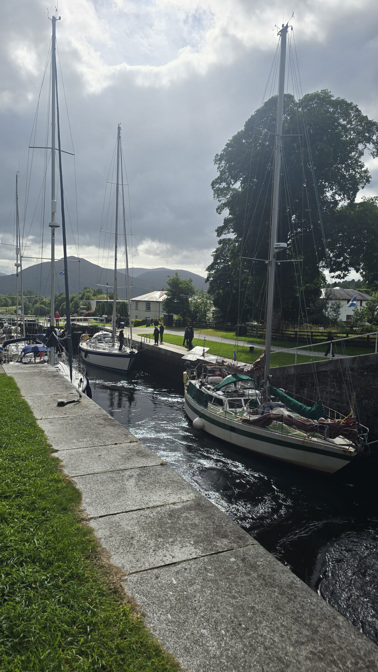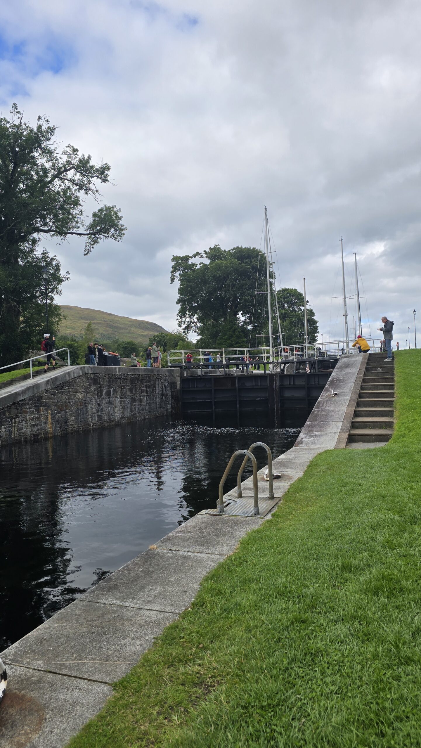 Zurück dann hängen die Regenwolken schon mehr als tief, der Ben Nevis versteckt sich, aber an und an kommt die Sonne durch. Wir besuchen Neptunes Staircase- die größte Schleusentreppe des Kaledonischen Kanals mit 8 Schleusen- gerade werden 4 Segler hinauf geschleust. Ein tolles Schauspiel. Dann geht es zurück zum Hotel. Ein gemeinsames Abendessen beschließt unseren Tag. Floris kündigt sich an und mit ihm ein Wirbelsturm, der gerade erst auf Orkanstärke zurückgestuft wurde.