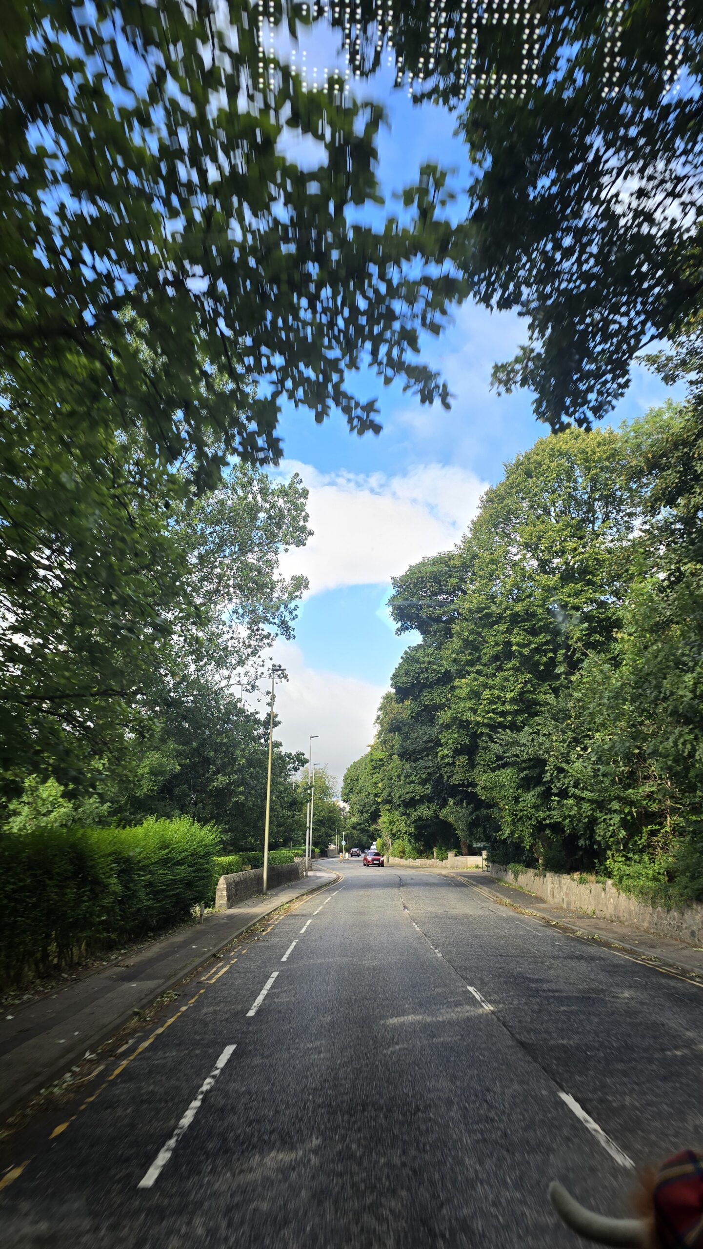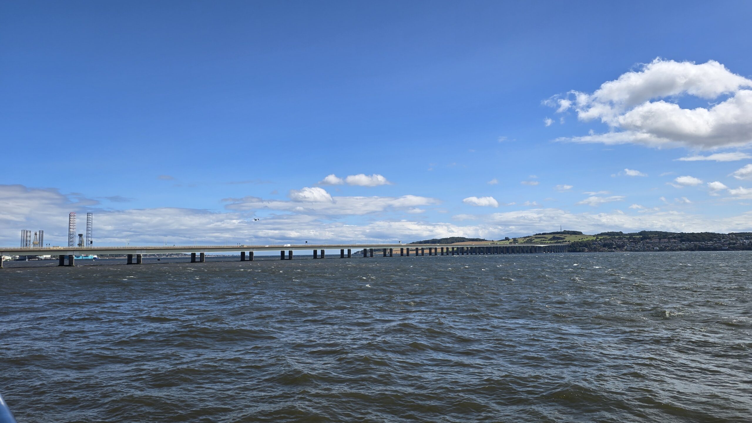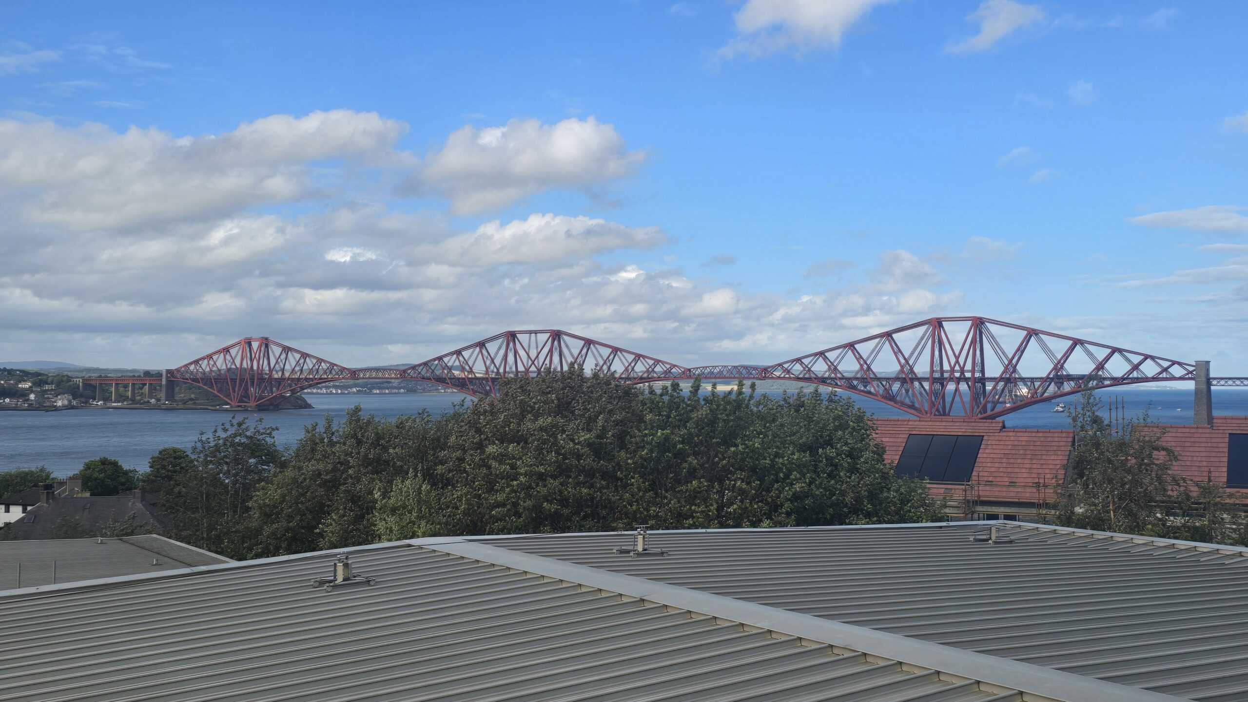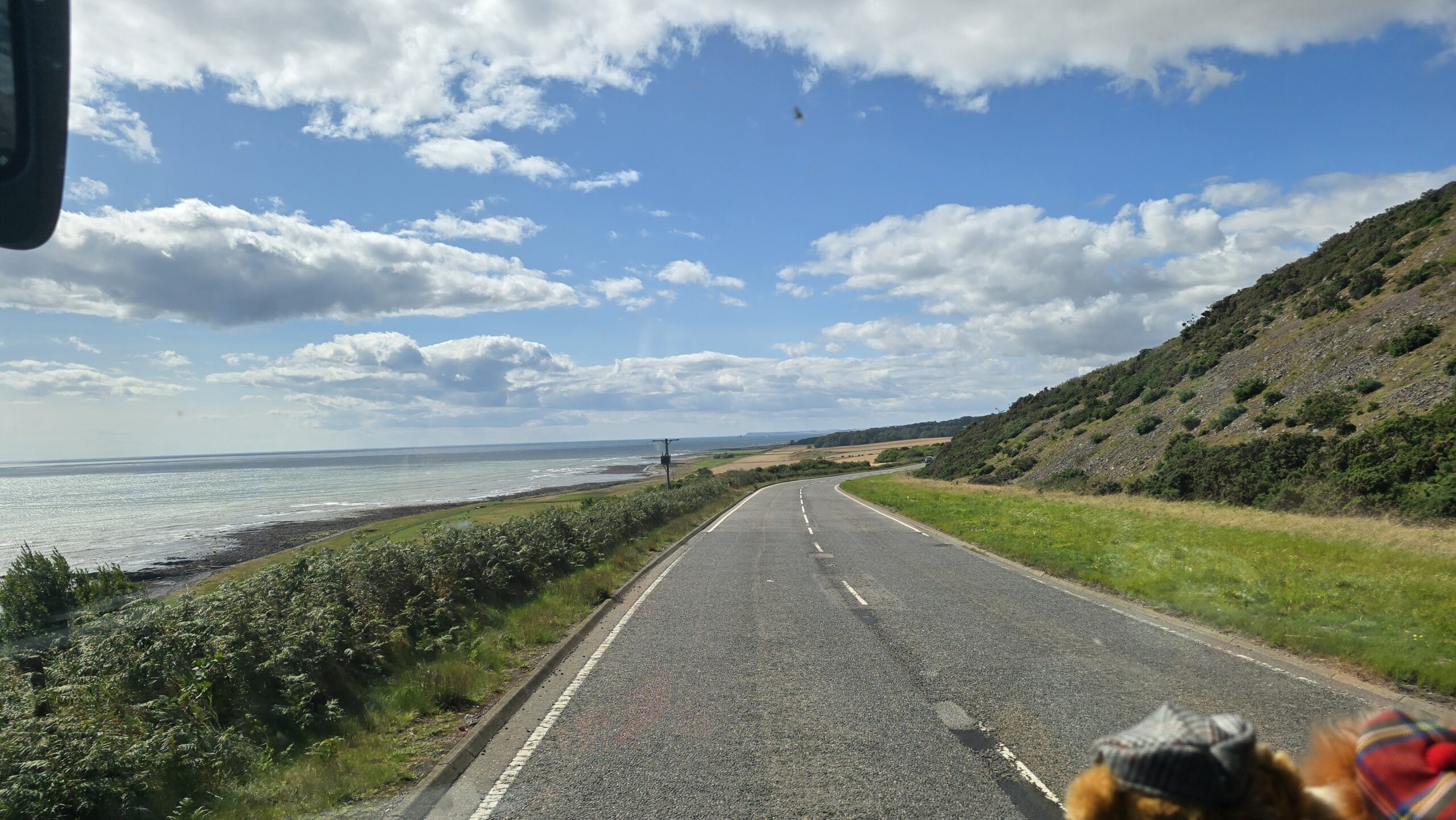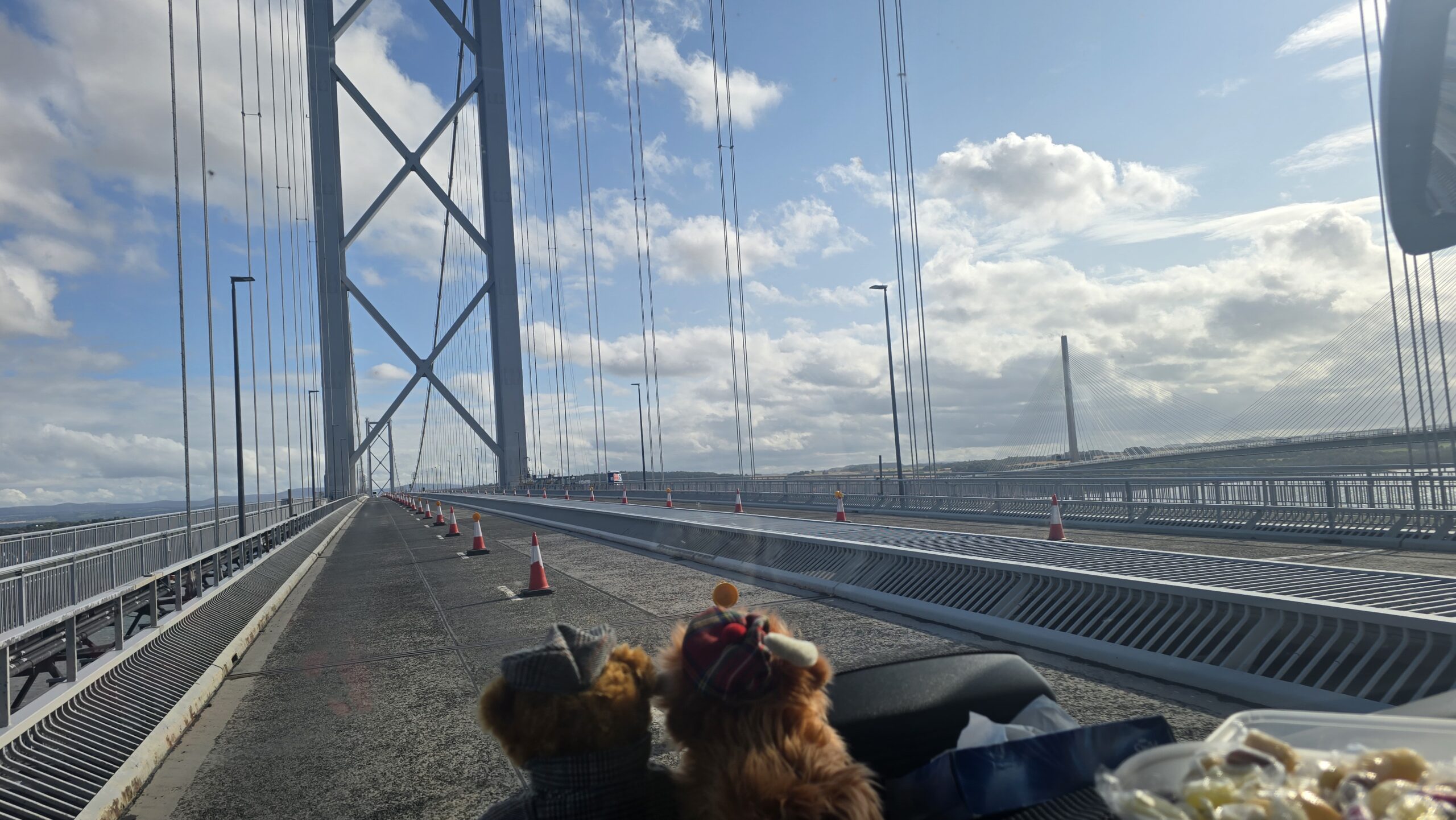 Aber auch die schönste Zeit vergeht- also heißt es: Aufbrechen und Weiterfahren. Wir überqueren den gewaltigen Fjord des Flusses Forth- den Firth of Forth über die alte Straßenbrücke, die nur noch von Bussen, Taxen, Fahrrädern und Fussgängern überquert werden dürfen. So haben wir einen tollen Blick auf die Eisenbahnbrücke, auch roter Drache genannt, und auf die neue Straßenbrücke, die Queensferry Crossing. Das reicht uns aber noch nicht, also stoppen wir am Aussichtspunkt und haben nun alle 3 Brücken über den Forth vor uns. Am späten Nachmittag checken wir im Hotel ein und verabschieden uns erst einmal von unserem Busfahrer John. Er hat morgen frei, kommt aber zum Ausflug übermorgen wieder.