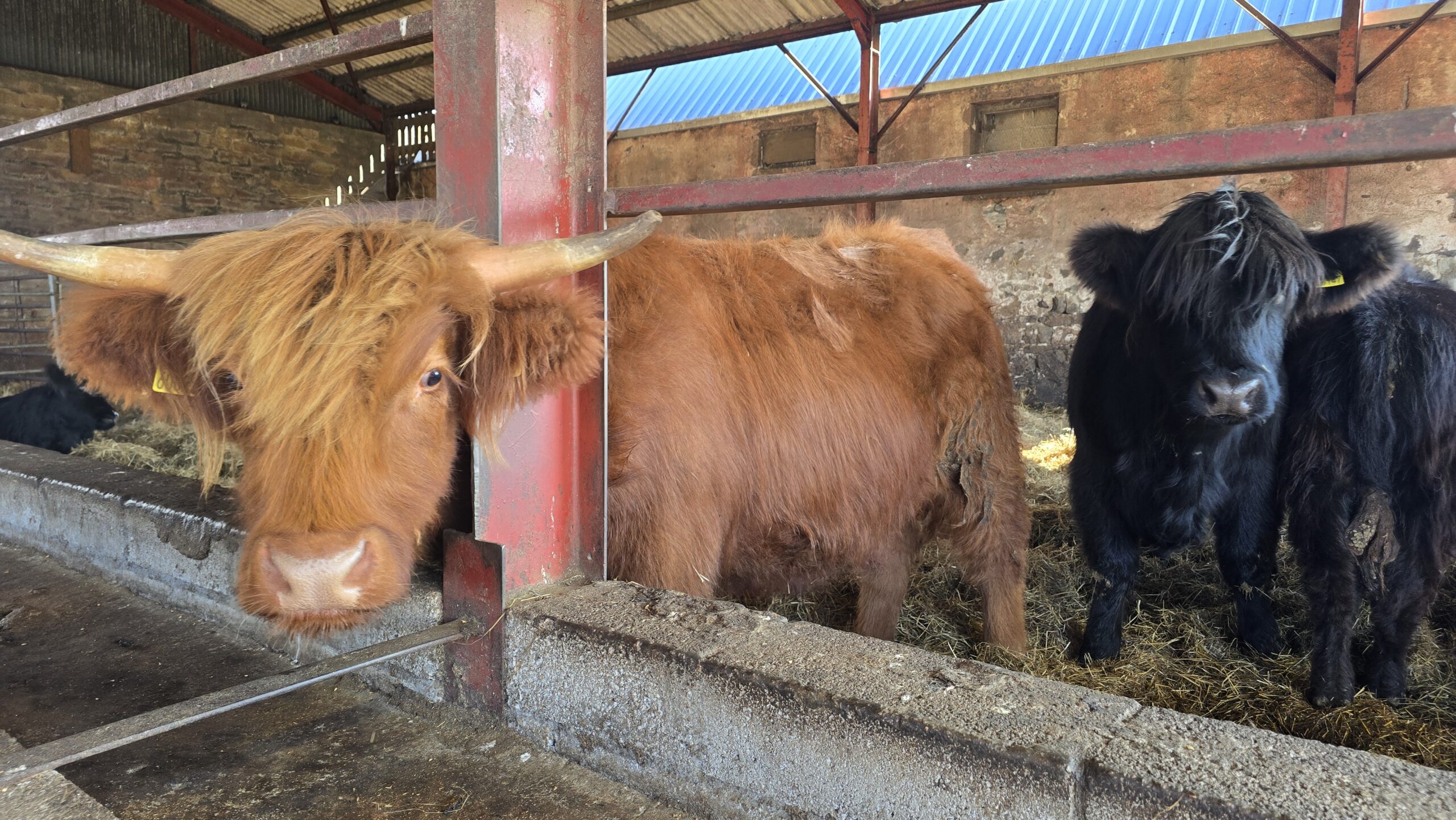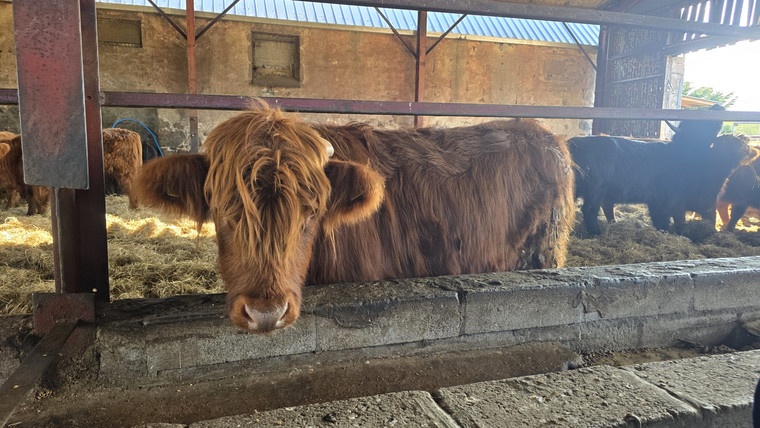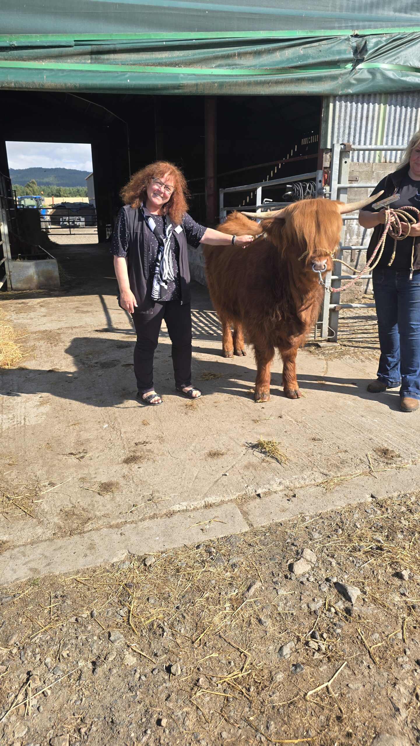 Am Morgen heißt es wieder: Koffer laden, wir verlassen Aberdeen und fahren aufs Land. Wortwörtlich, denn der Besuch einer Farm steht auf unserem Programm. Grace bewirtschaftet in Aberdeen Shire eine Rinderfarm und ihre Rinder haben mehrfach Preise gewonnen, sind hochdekoriert und das Fleisch liefert sie sogar an den königlichen Hof. Dabei arbeitet sie nur mit ihrer Tochter auf dem Hof, hat alles selber aufgebaut, Corona-Zeiten überstanden und stellt sich nun den Herausforderungen der steigenden Preise, den horrenden Energiepreisen… Wir können die Kühe und Jungbullen im Stall erleben, der größte Teil der Herde ist aber draußen, wie fast jeden Tag des Jahres. Duchess heißt ihre erfolgreichste Highlander-Kuh, Herzogin. Grace erzählt, dass sie ihre Model-Macken hat, aber sie liebt das Kämmen und Schamponieren vor der Show. Dann können auch wir kämmen und auf Tuchfühlung mit den imposanten Hörnern der Highland-Kühe gehen. Wow. Im ehemaligen Stall sitzen wir dann beisammen, kosten Shortbread und Würstchen aus Highland Beef, Grace erzählt von ihrem Hof und wie stolz sie ist, dass ihre Tochter nun nach ihrem Studium bei ihr im Betrieb ist.