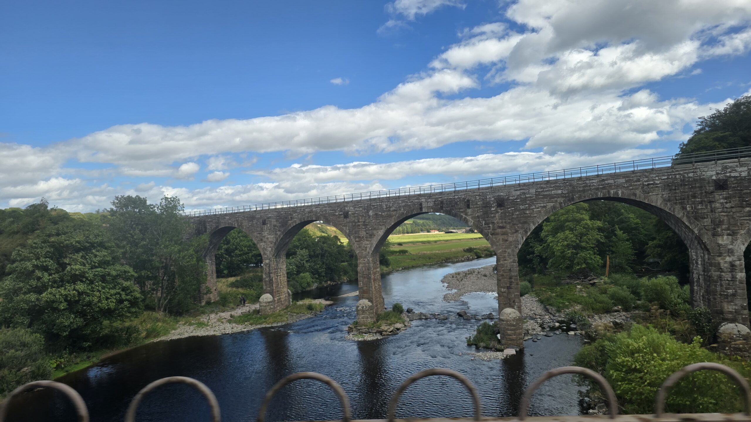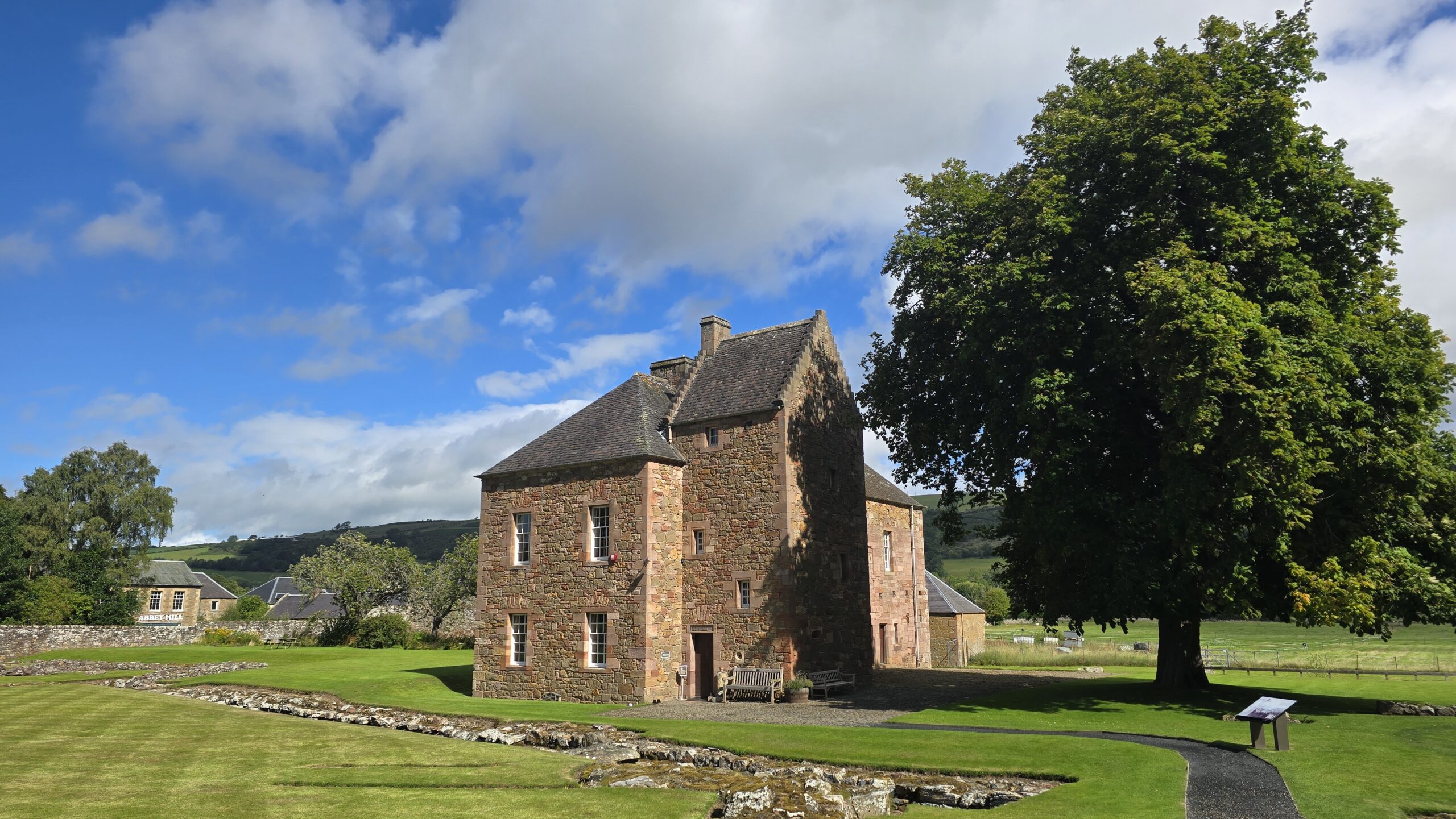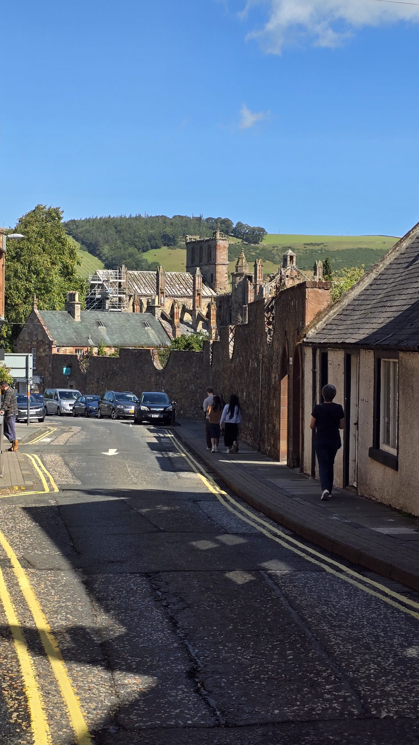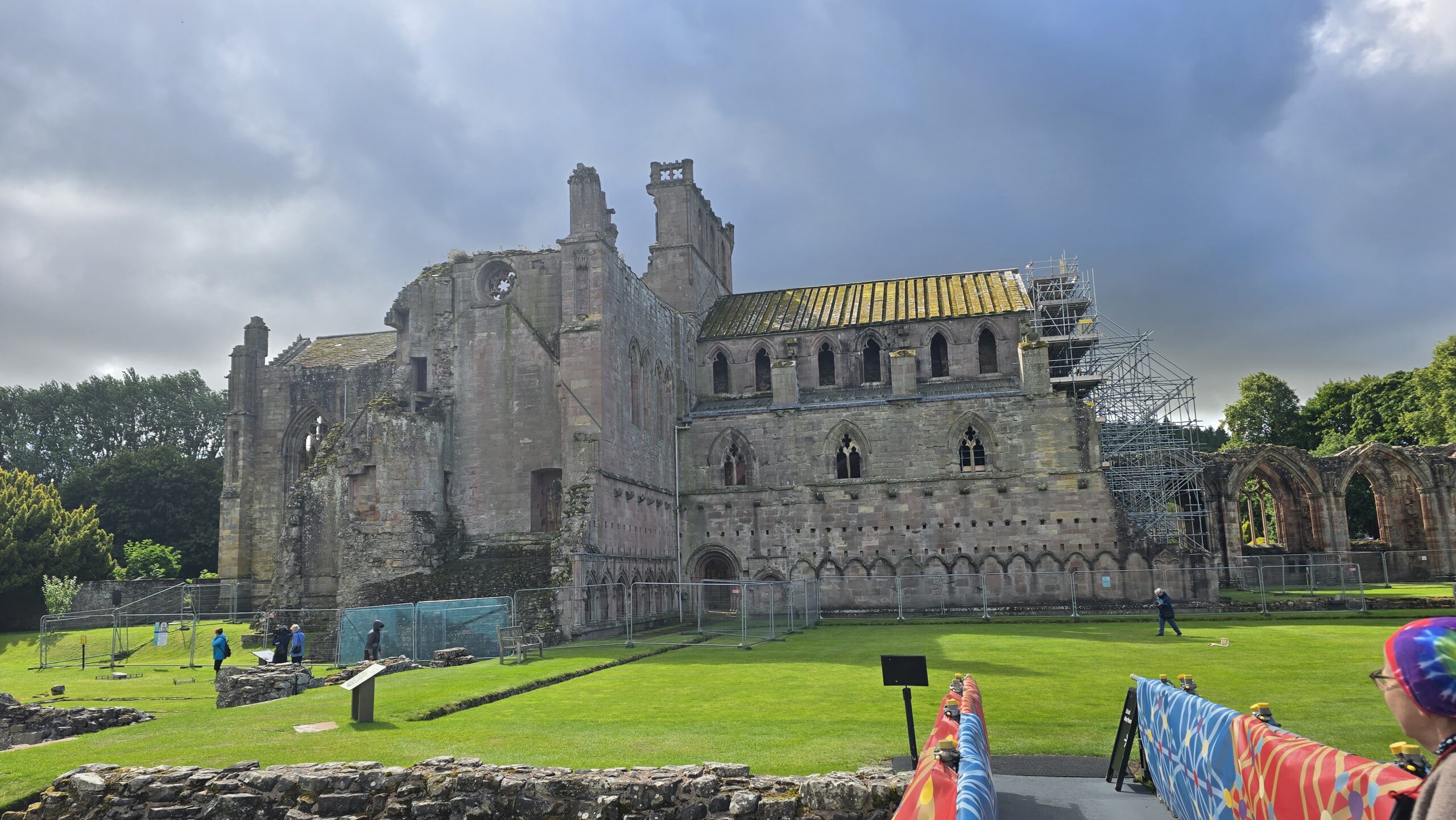 Die Nacht war kurz doch ein gutes Frühstück gibt uns einen guten Start in den Tag. John kommt wieder mit unserem Bus und fährt uns nach Süden. Eine der vier großen Grenzlandabteien wollen wir besuchen: Melrose Abbey. Kurz vor Melrose überqueren wir den Fluss Tweed- Namensgeber für den berühmten Stoff- und stoppen für ein paar Fotos am Viaduct, der alten Eisenbahnbrücke, und der alten Straßen-Brücke. 3 Brücken führen mittlerweile über den Fluss und in Anlehnung an das römische Fort Trimontium ganz in der Nähe wird der Ort auch Tripontium genannt…