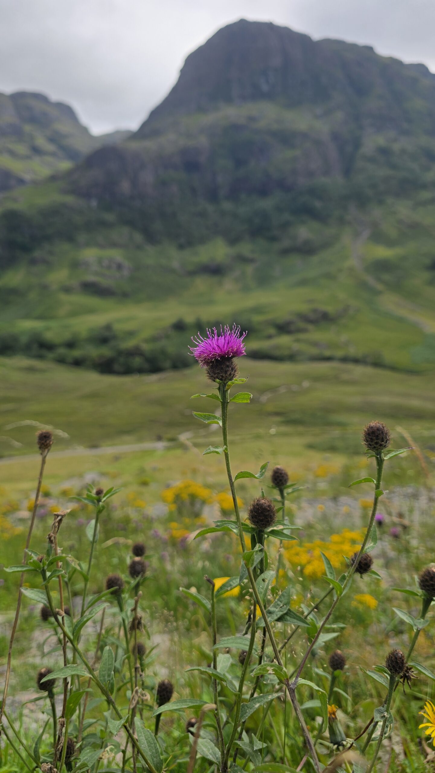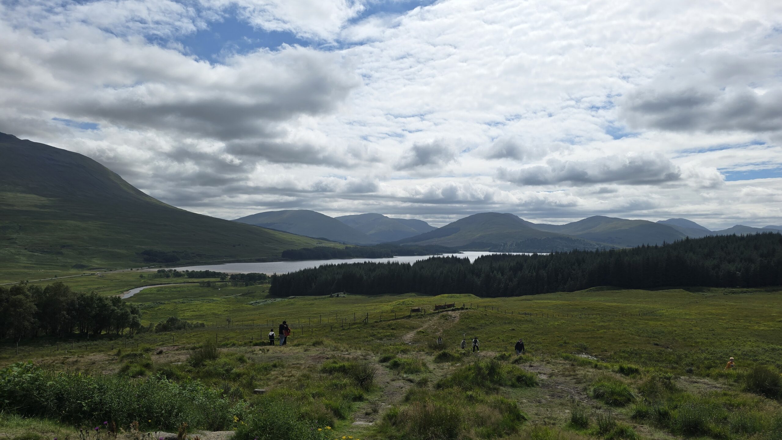 Zunächst mit einer Hiobsbotschaft:die Straße vor uns ist gesperrt und der Umweg wird uns locker 3 Stunden kosten, so viele Straßen gibt es hier nicht… John aber ist optimistisch, er fährt erst einmal zum Nordufer des Loch Lomond und fragt dort andere Busfahrer. Als die auch nicht weiterhelfen können nimmt er das Wagnis auf – und wird belohnt. Ein anderer Bus unseres Busunternehmens Festival Travel , der uns entgegenkommt, bestätigt, dass die Straße frei ist- supi! Also verlieren wir keine Zeit, oberhalb des Loch Tulla stoppen wir am Aussichtspunkt, fahren dann durchs Rannoch Moor und da es trocken war bisher spazieren wir auch auf den Aussichtspunkt hier, (ohne Ärger mit unserem Busfahrer zu befürchten)- denn da sind wir auf Torfboden. Unglaublich, wie das schwingt und nachgibt.