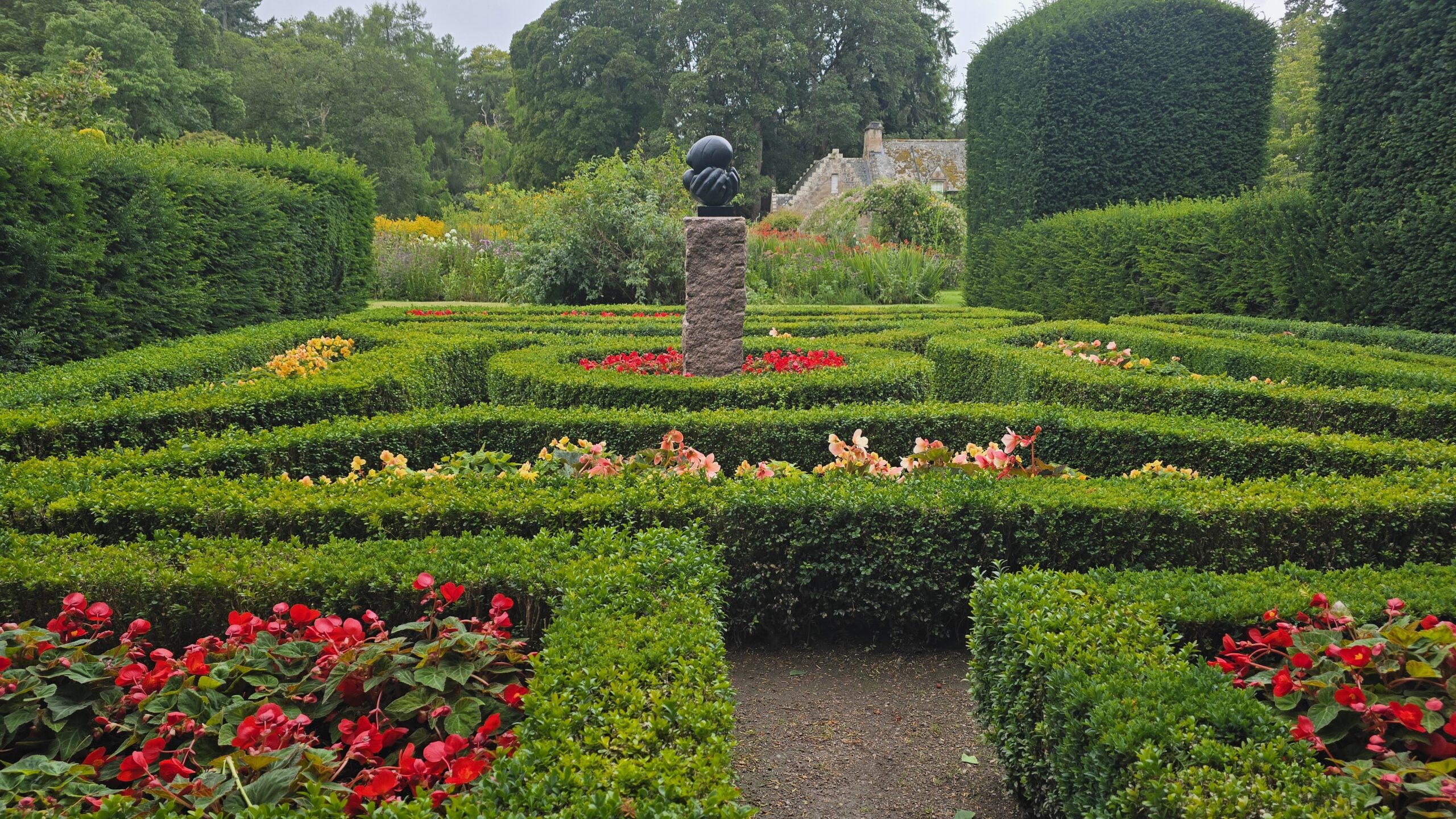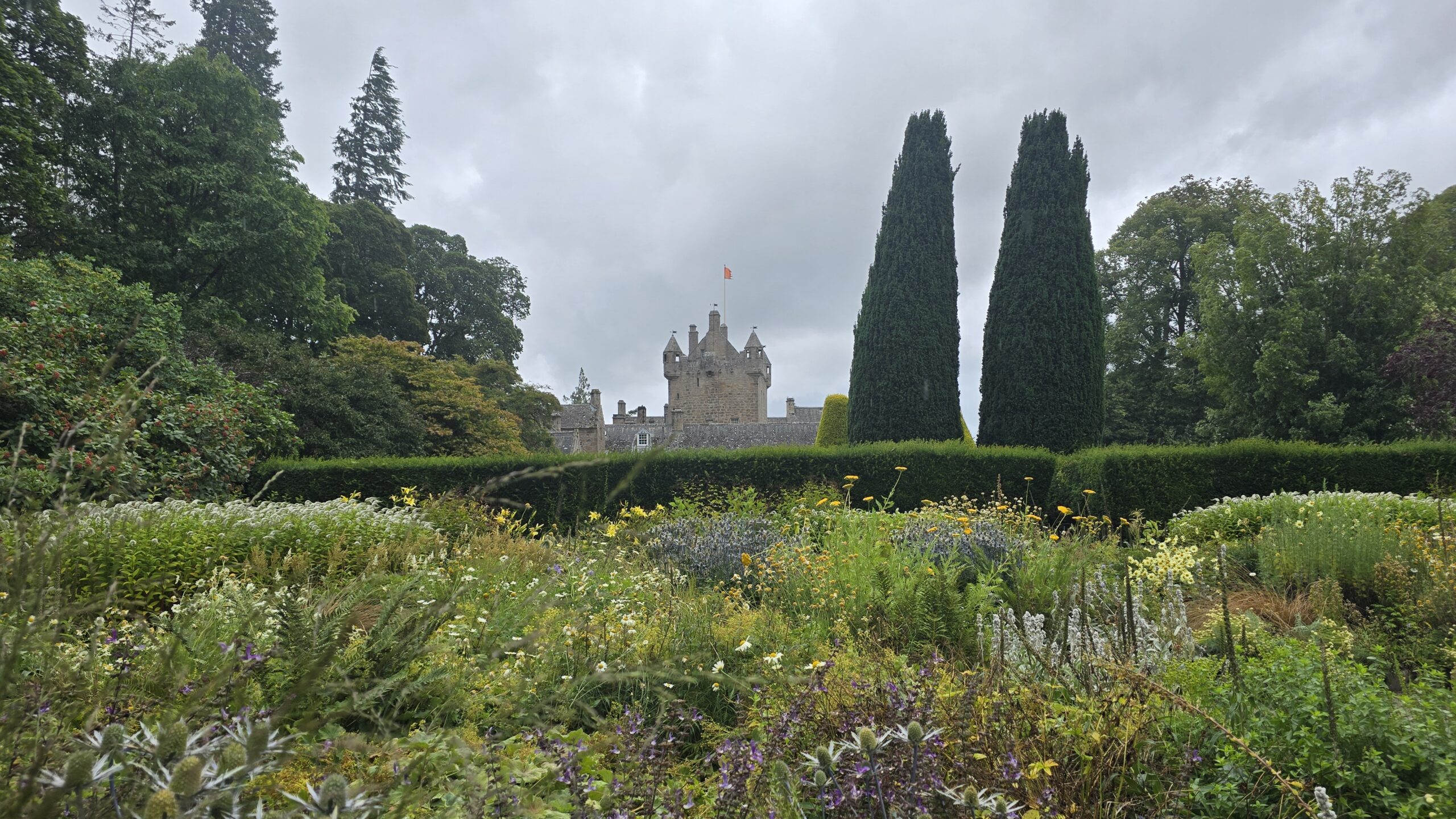 Nach der Mittagspause geht es weiter Richtung Norden: Cawdor Castle und seine Gärten wollen wir besuchen. Der Sage nach wollte der Thane of Cawdor im 15. Jahrhundert eine neue Burg errichten, ein Traum gab ihm folgendes auf: Belade einen Esel mit Gold, schick ihn los, wo er sich niederlegt, da baue Dein neues Haus… Gesagt , getan. Der Esel legte sich unter einer Stechpalme nieder und der Stamm dieses Baumes ist noch heute im Untergeschoss des Turms zu sehen. Mit unseren Audio-Guides entdecken wir noch sehr viel mehr, Möbel und Ausstattung sind kostbar, die Familie hat in den Jahrhunderten etliches zusammengetragen, noch heute ist die Burg in Familienbesitz. Beeindruckend aber auch die drei Gärten ringsherum. Obwohl das Wetter nicht ganz mitspielt lassen wir uns die natürlich nicht entgehen: den ummauerten Garten, der bereits um 1600 entstanden ist. Er beherbergt Blumen, Kräuter und ein Labyrinth. Neben der Burg lockt ein wunderschöner Blumengarten und hinter der Burg wurde ab 1960 der Wilde Garten angelegt.