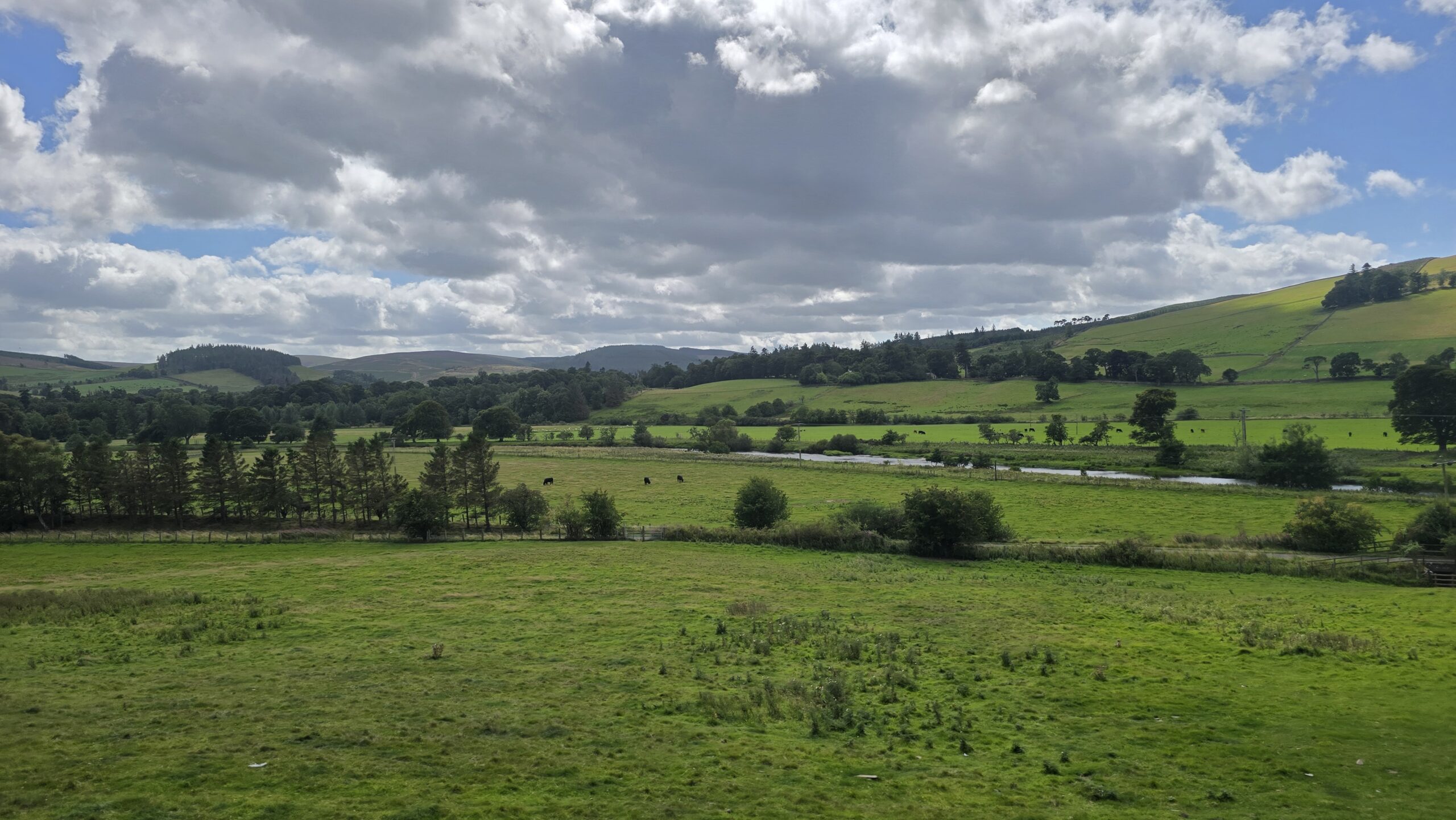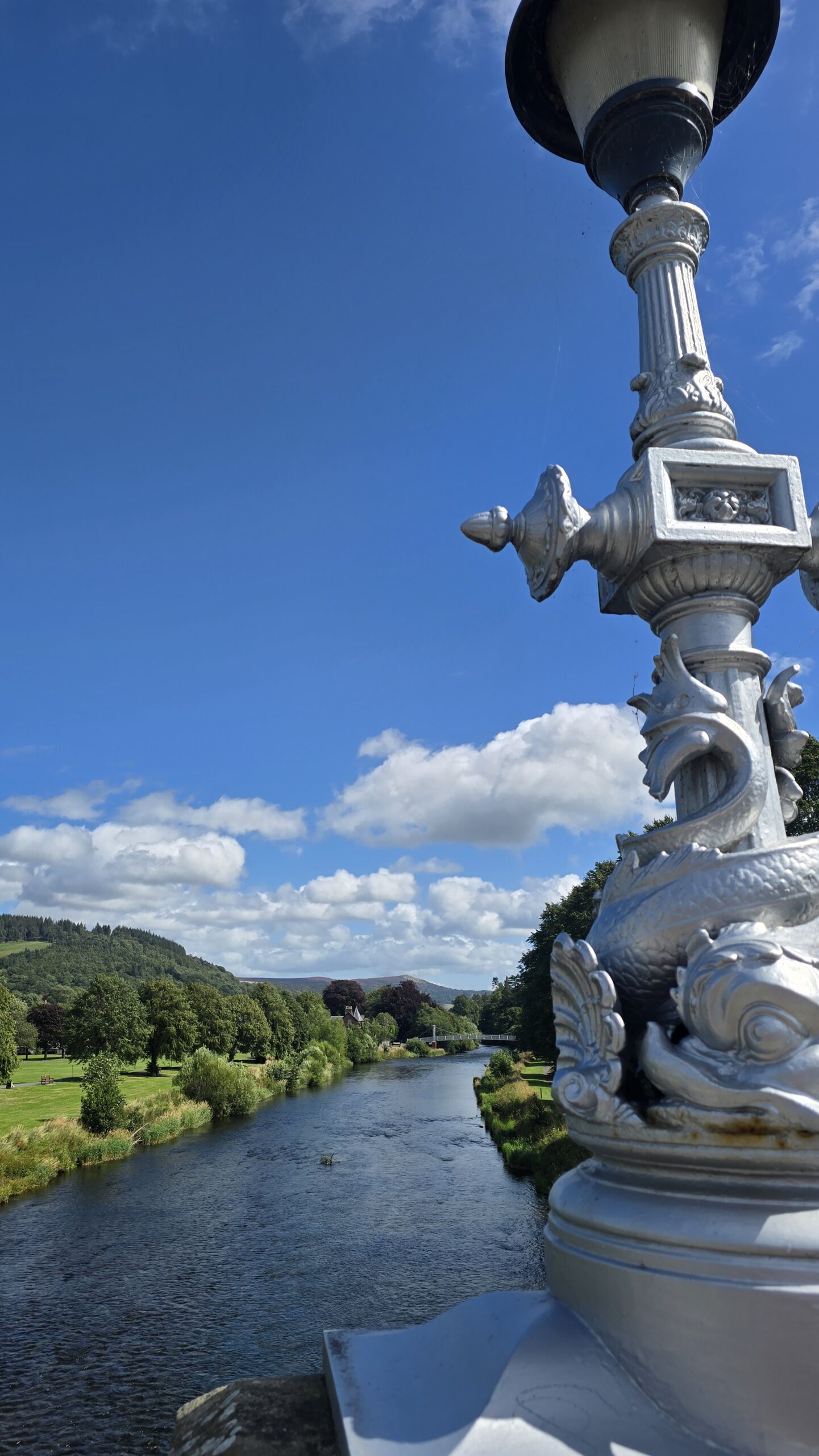 … und dann geht es durch das Tal des Tweed weiter nach Peebles. Unterwegs eine kleine Picknick-Pause- wir genießen noch einmal schottische Köstlichkeiten- natürlich einen Whisky in einem Souvenir-Glas, das alle Gäste behalten konnten, die Pralines aus Melrose, Ginger Nuts und Cookies. Wir nutzen die Gelegenheit und bedanken uns bei unserem Busfahrer John für sein sicheres und souveränes Fahren. In Peebles dann ein gemeinsamer Spaziergang die High Street entlang bis zur Brücke über den Fluss. Was für ein toller Blick von hier: auf die Kirche und das alte Fachwerkhaus, den Tweed, die Flußauen, die Stadt. Dann geht es zurück zum Bus.