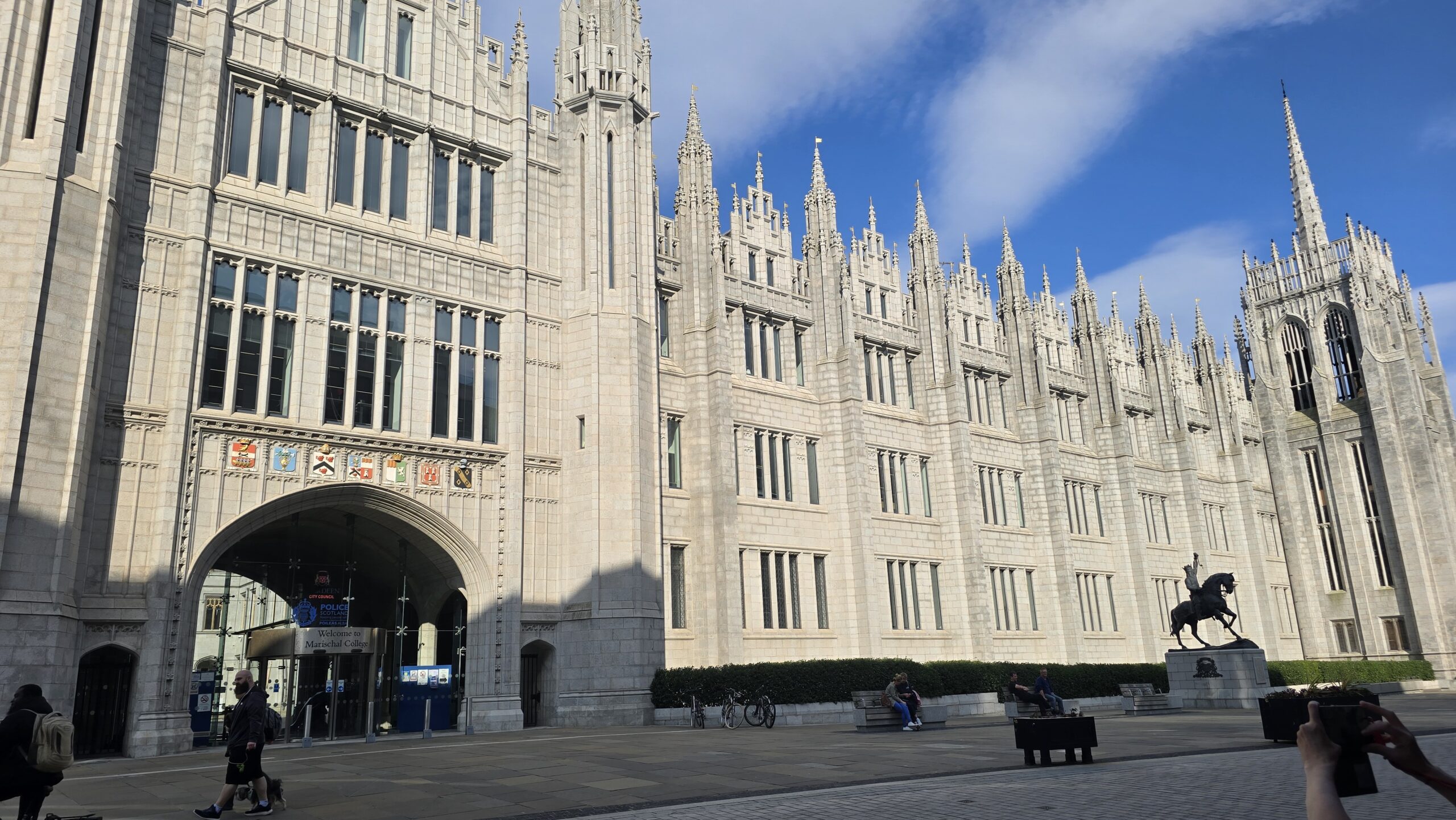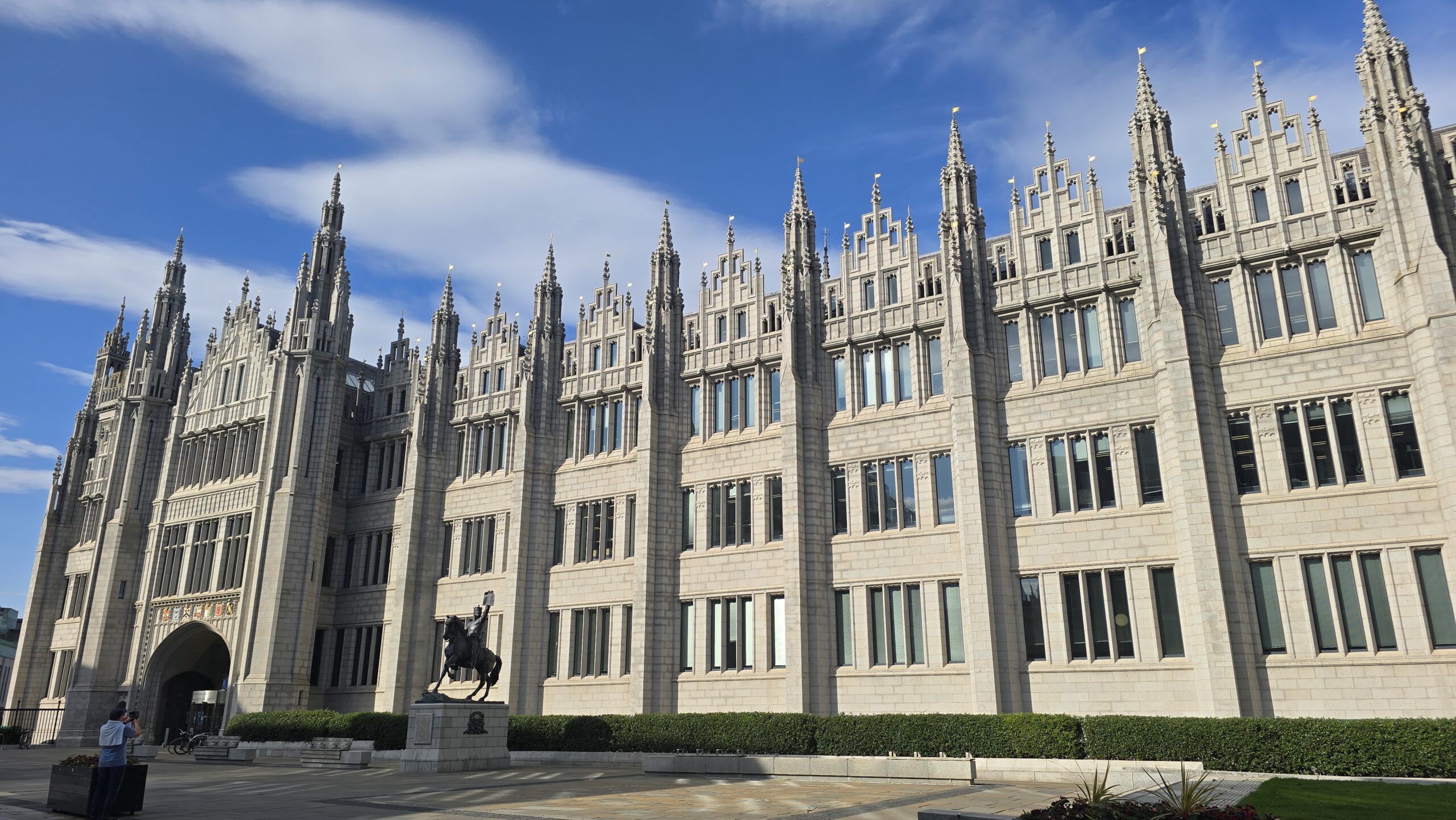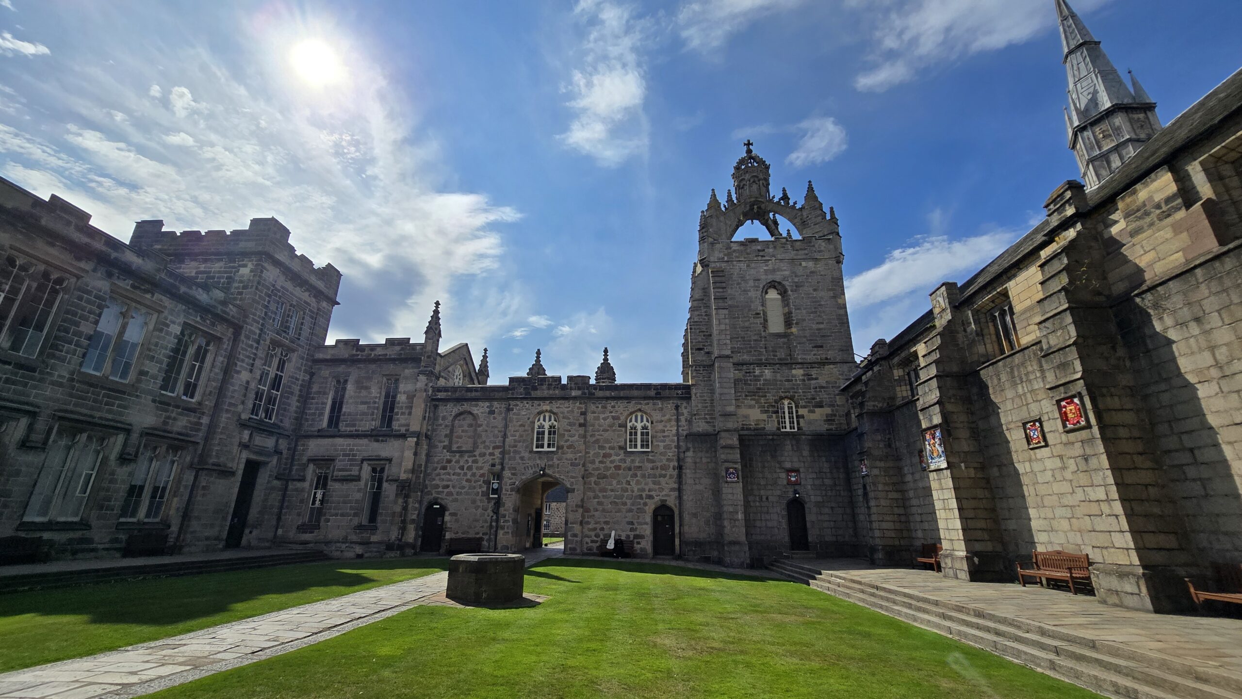Dann heißt es: weiterfahren. Schließlich wollen wir noch an die Ostküste, nach Aberdeen. Eine kleine Servicepause unterwegs und am frühen Nachmittag erreichen wir unser Ziel. Wir treffen unsere Stadtführerin Isabel wie vereinbart am Kings College, streifen mit ihr durch dieses ehrwürdige Gebäude, erkunden die historische Umgebung und fahren dann ins sogenannte Fischerviertel. Früher den Fischern und ihren Familien vorbehalten sind es heute angesagte und begehrte Wohn(T)räume. Alle hatten früher einen Schuppen- auch die sind vermietet und werden für alle möglichen Einrichtungen genutzt… Am Strand geht es zurück zum Bus und weiter in die Stadt. Wir steigen aus und spazieren gemeinsam zum Marishall College, heute Sitz der Stadtverwaltung- immer noch das größte spätgotische Gebäude aus Granit. Umwerfend und im Sonnenschein funkelnd und glänzend. Daher hat Aberdeen auch seinen Beinamen: die funkelnde Stadt, viele Häuser sind hier aus Granit und funkeln in der Sonne. Noch ein Abstecher zum ältesten Gebäude und für ein Eis reicht die Zeit allemal… Wir verabschieden uns von Isabel und fahren ins Hotel. Hier wartet am Abend wieder ein leckeres 3-Gänge-Menü auf uns.