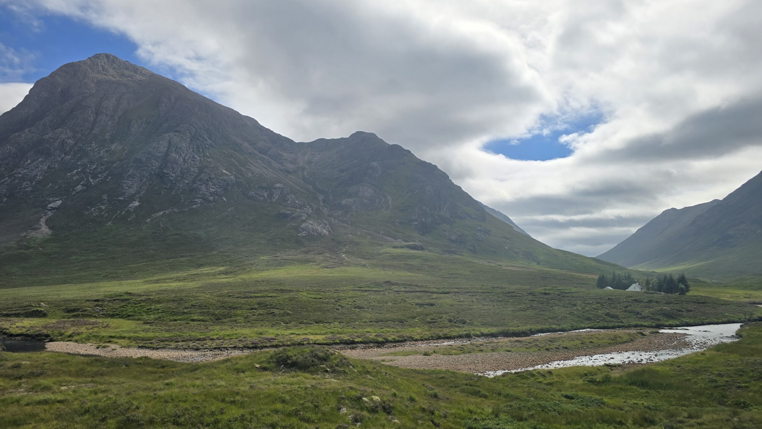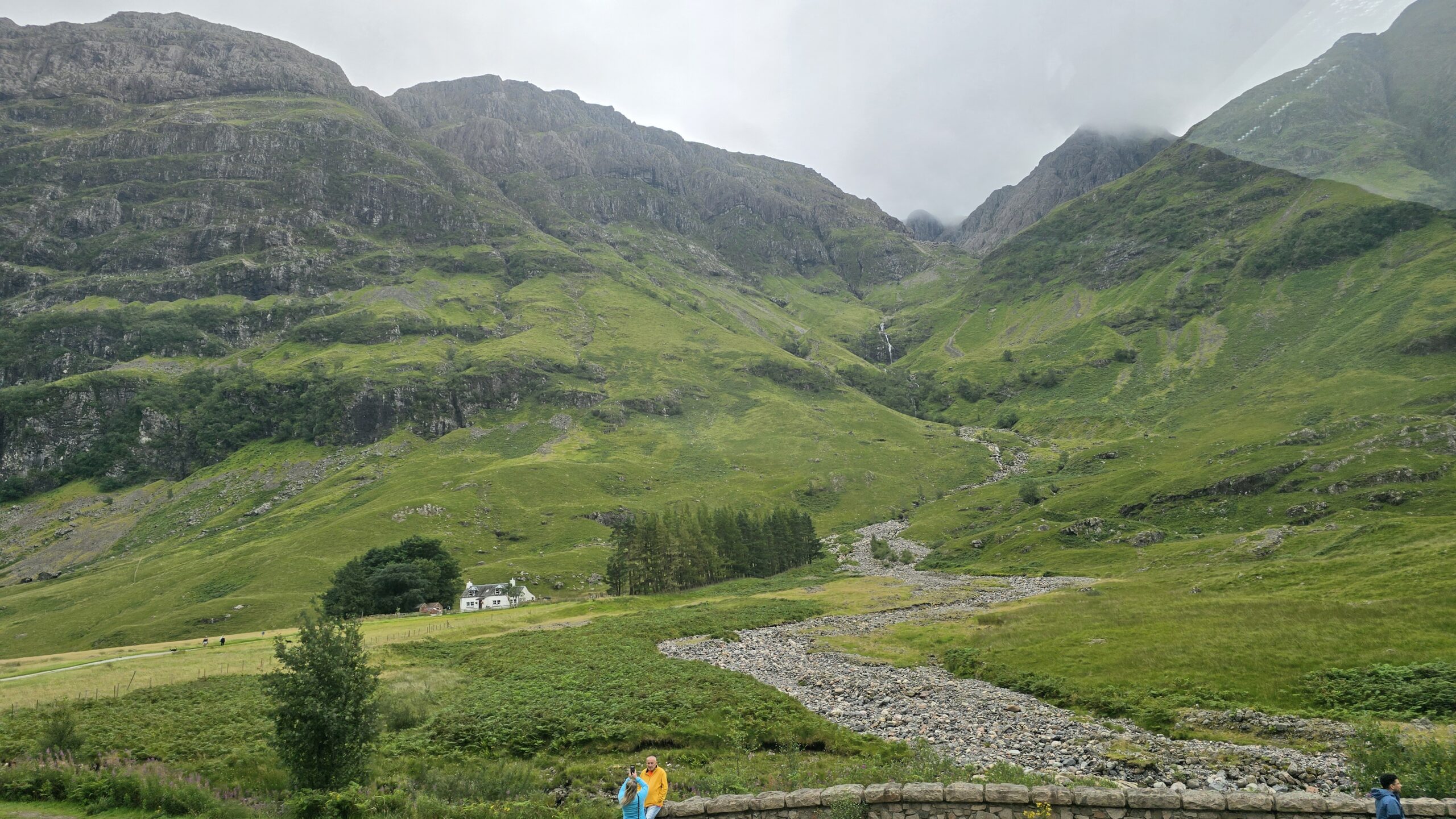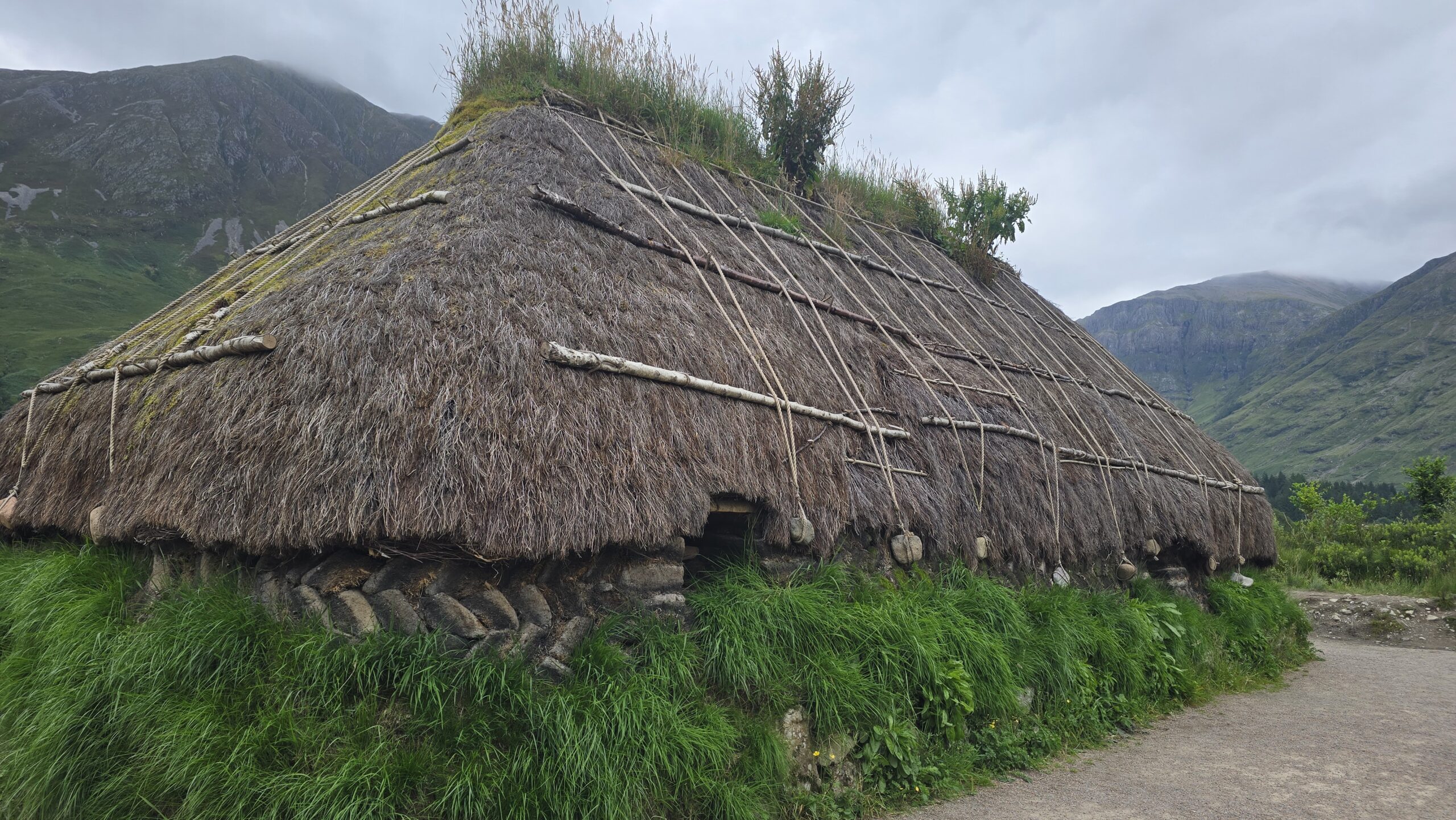 Nun folgt die wohl schönste Straße durch die Highlands: ins Glen Coe, dem schönsten Tal Schottlnds, hinein. Warum es auch Tal der Tränen heißt habe ich unterwegs erzählt. Noch heute kann man zu jeder Zeit in Schottland Hilfe finden, wenn man unterwegs ist- das damals aber das Gesetz der Gastfeundschaft so schändlich mißbraucht wurde durch die Campbells um die Mc Donalds zu ermorden- und auch noch auf Befehl des Königs- ist nach wie vor ein Schandfleck in der Geschichte der schottischen Clans. Am Aussichtspunkt auf die Three Sisters- die Berge des Massivs begrüßt uns ein Piper- ein Dudelsackspieler- und unsere Welt ist wieder in Ordnung. Im Besucherzentrum können wir uns umsehen, Filme zur Geologie des Tals oder zum Massaker ansehen oder einfach nur die Nachbauten der Torfhütten aus damaliger Zeit bewundern.