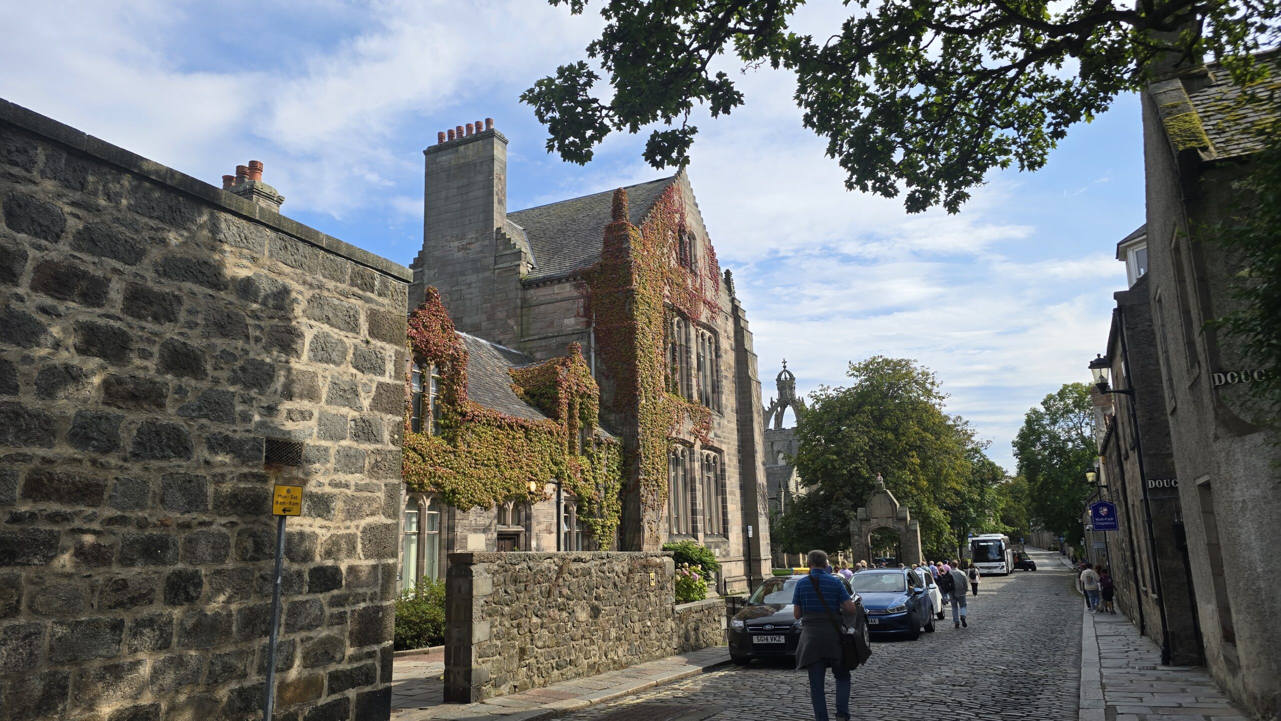 Tilman nimmt uns dann mit zu einem Spaziergang zur Universität. Wow! Was für ein Rundgang durch Säulengänge, wuchtige Sandsteinmauern und gotische Kirchenfassaden. Er begleitet uns noch zum Hotel, hier verabschieden wir uns von ihm und Mike und können unsere Zimmer beziehen. Ein gemeinsames Abendessen beschließt unseren ersten Tag in Schottland, dann bis morgen.