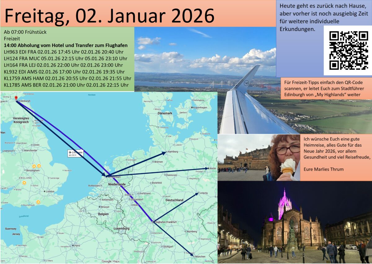 Und auch am Samstag ist der KLM Flug nach London so verspätet, dass der Anschluß nach Berlin weg ist… also nochmals übernachten- was für eine Rückreise! Mittlerweile sind alle wieder gut zu Hause angekommen und auch unsere Verlängerer haben die Zeit in Edinburgh noch genossen. Ich sage herzlichen Dank für einen tollen Jahreswechsel, bleibt gesund (oder werdet) und paßt auf Euch auf. Ich wünsche Euch für das neue Jahr viele neue Entdeckungen auf Reisen und unterwegs- gern wieder einmal gemeinsam. Eure