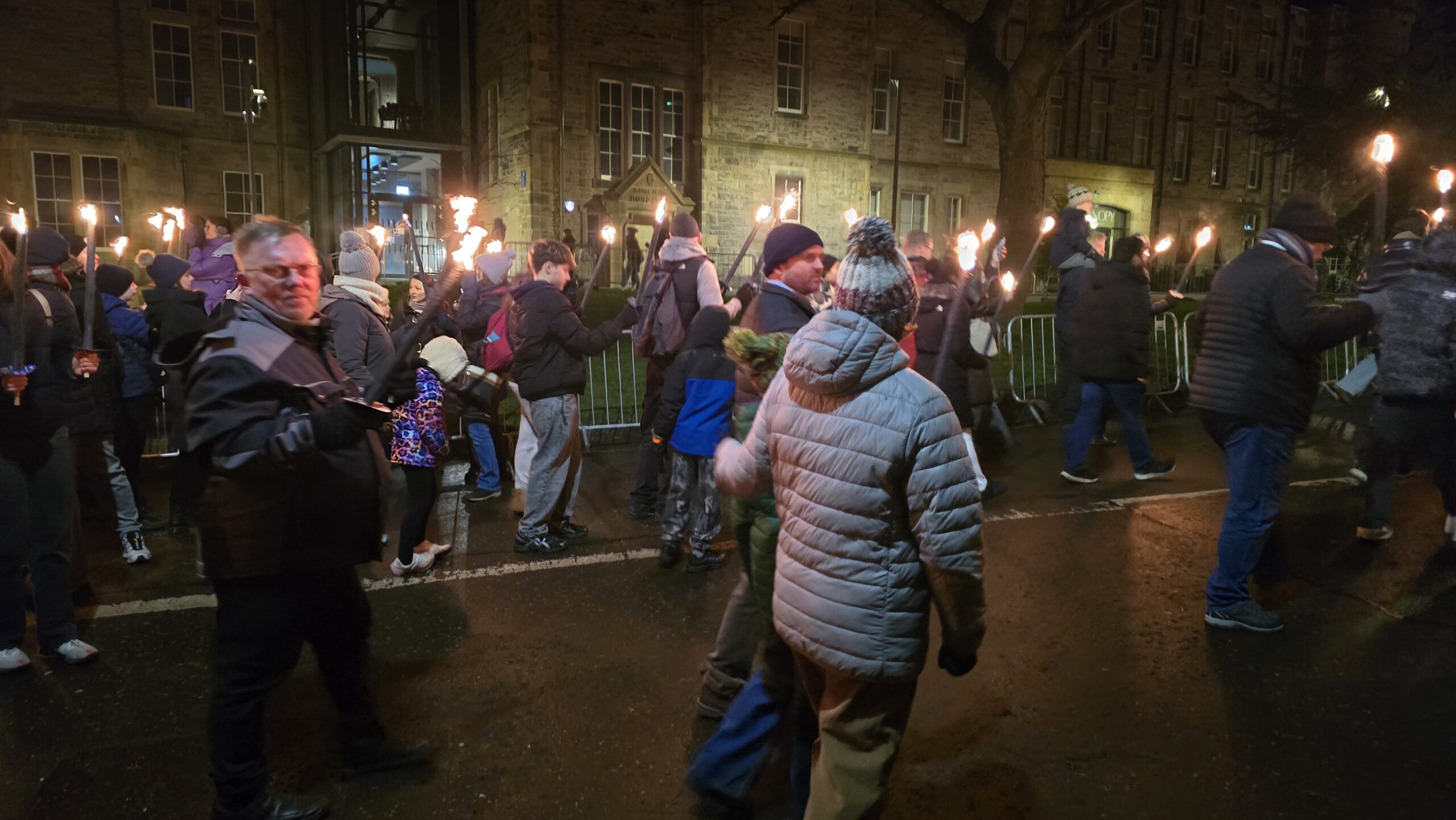 Pünktlich zum Vorprogramm der Torchlight-Prozession fahren wir mit dem Bus zu den Meadows, einem großen Stadtpark unterhalb des Castles. Hier haben sich bereits Tausende versammelt und lange Warteschlangen haben sich gebildet. Gut, dass wir nicht nach Fackeln und Armbändern anstehen müssen… also geht es gleich durch die Red-Line und nun hieß es – warten. Ab und zu verirren sich kleine Nieselregenwolken, verschwinden aber rasch wieder. Feuerkünstler beeindrucken mit ihrem Darbietungen und aus den Lautsprechern dröhnt ausschließlich Musik, die irgendetwas mit Feuer zu tun hat… Schließlich geht es heute darum, die Dunkelheit zu vertreiben und die Feiern zur Begrüßung des neuen Jahres zu beginnen. Endlich sind auch wir an der Reihe, unsere Fackeln werden angezündet und dann reihen wir uns in die Prozession ein. Gemeinsam fließen wir im „Fluss aus Feuer“ durch die Altstadt bis zum Castle, unterwegs immer wieder Musik, Piper und Trommler. Was für ein Erlebnis! Das Castle ist bunt illuminiert und leuchtet weithin zum Jahresabschluß. Wir kennen den Weg zum Hotel, daher gehen wir individuell zurück und lassen den Tag ausklingen.