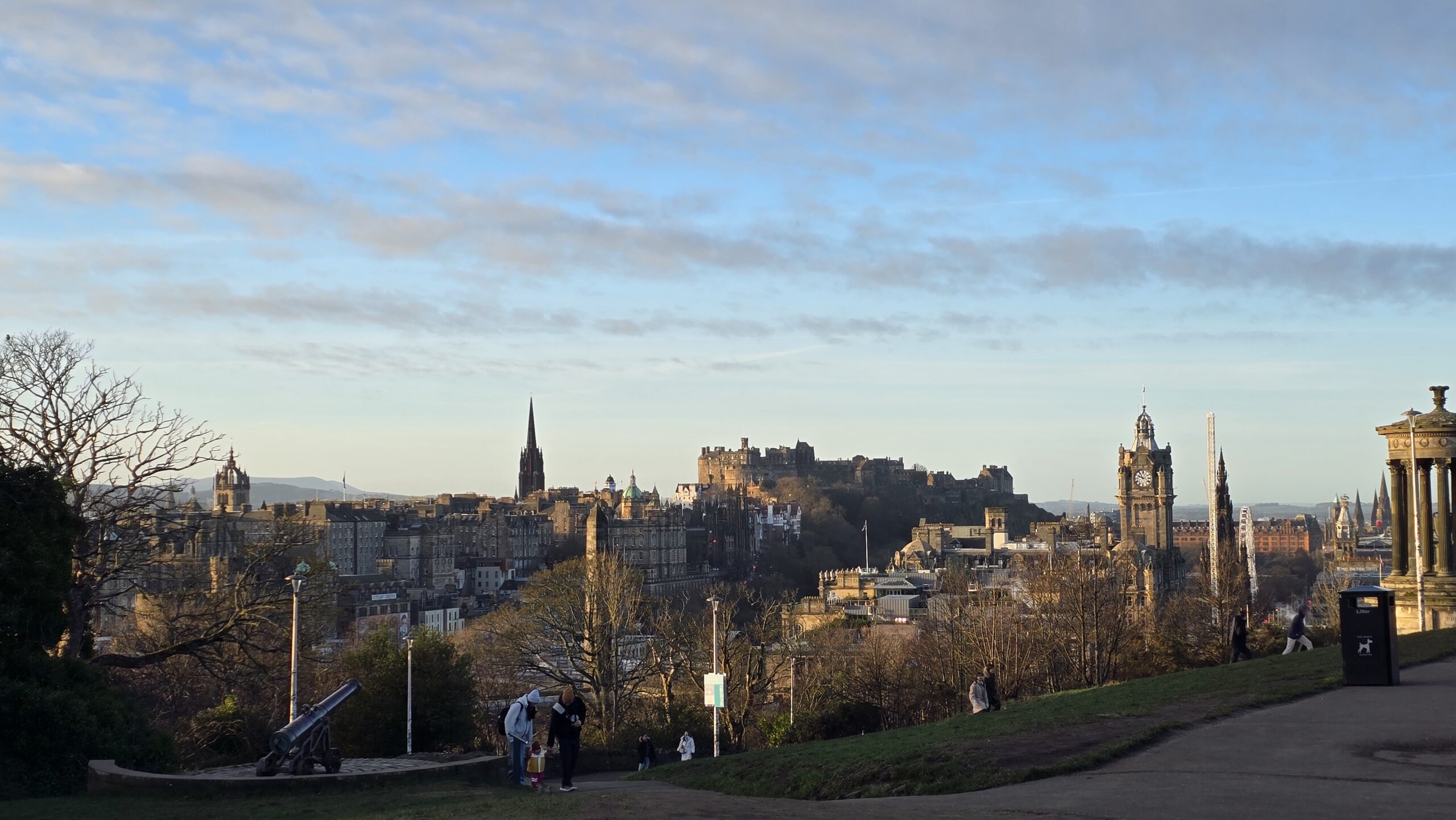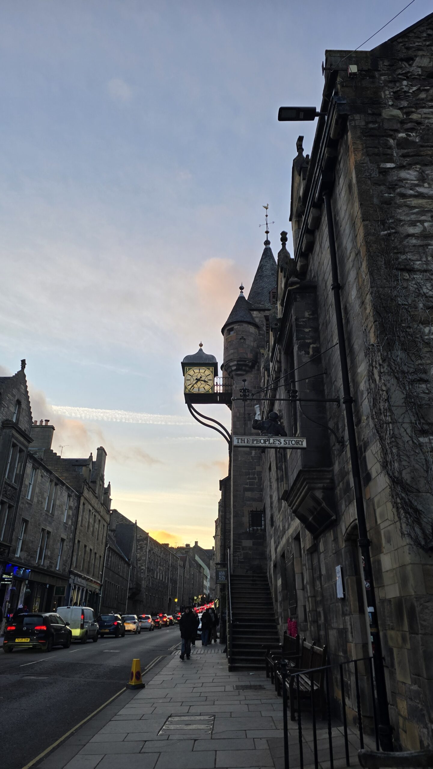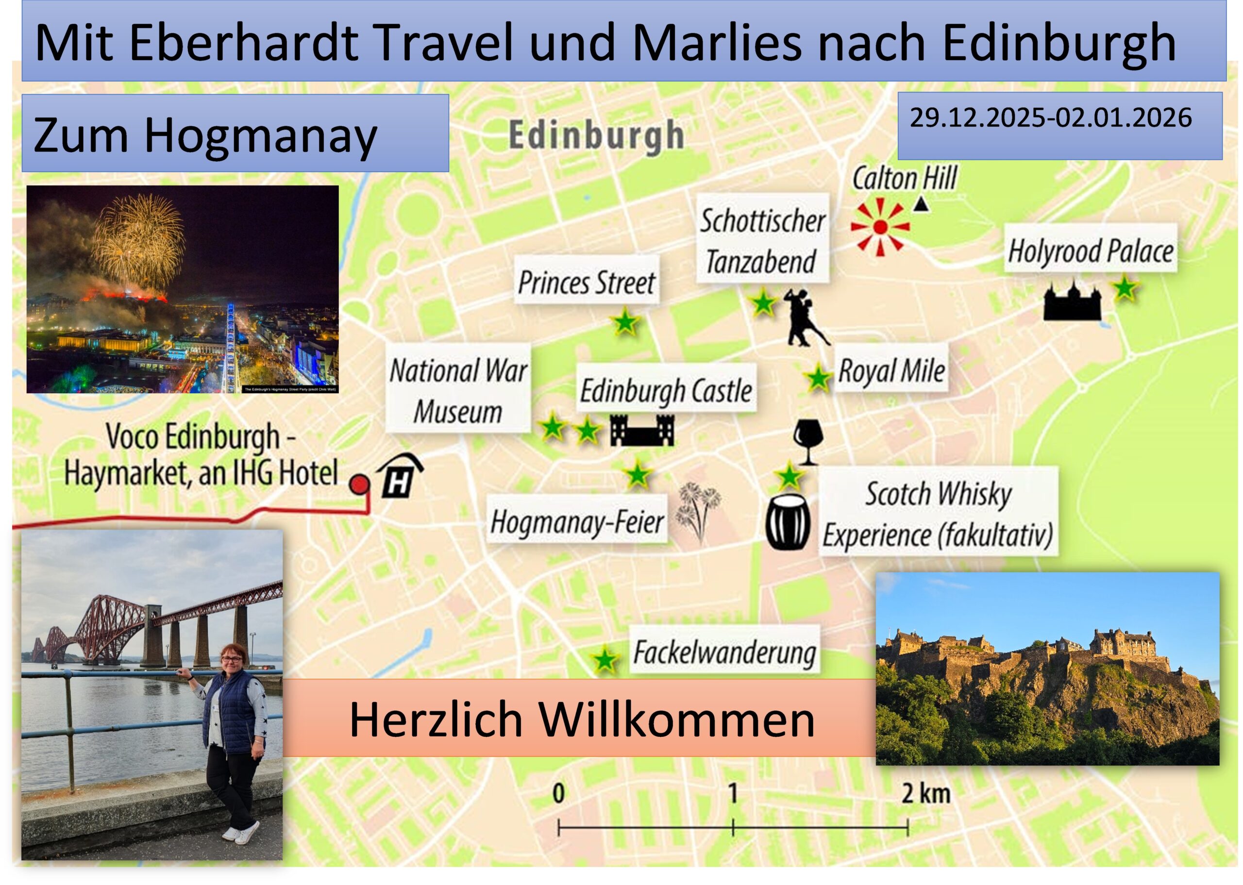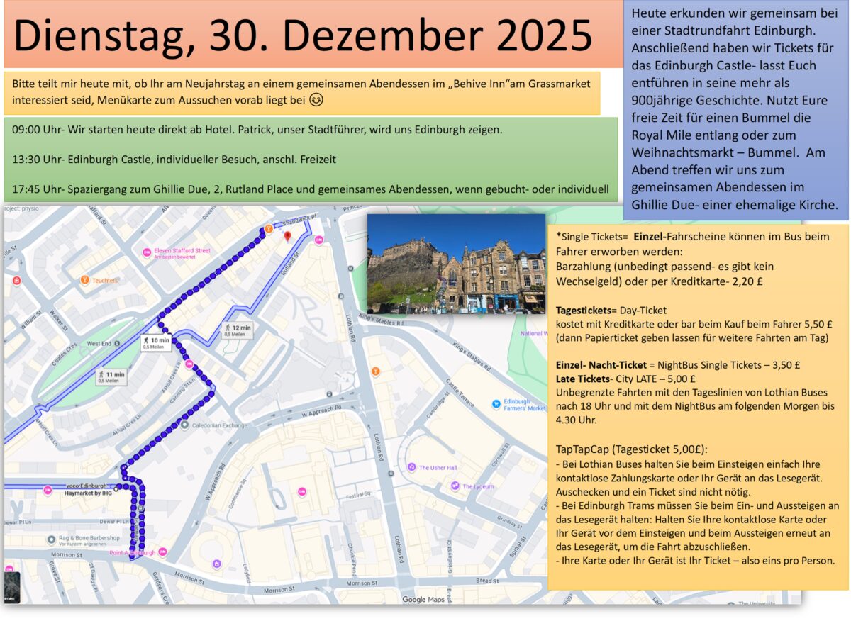 Heute können wir fast „ausschlafen“. Nach einem guten Frühstück, das keine Wünsche offen ließ, starten wir 9 Uhr mit Gary, unserem Busfahrer und Patrick, unserem Stadtführer. Zunächst geht es zur Neustadt, ebenso wie die Altstadt Edinburghs Weltkulturerbe der UNESCO. Am Charlotte Square sehen wir das Büro des ersten Ministers- quasi wie bei uns der Kanzler. Ganz ohne Wachen und Absperrungen… Auf dem Platz selber das Reiterstandbild von Prinz Albert, dem Gemahl von Königin Victoria. Ihm verdanken wir u.a. die kostenfreien Museen und Ausstellungen im Land. Wir passieren die Princes Street, das Denkmal für Sir Walter Scott und das berühmte Hotel „Balmoral“. Dessen Uhr im Turm geht immer einige Minuten vor, damit die Schotten ihren Zug, der direkt unterhalb des Hotels vom Bahnhof Waverley abfährt, erreichen 🙂 Weiter geht es zum Calton Hill, einem der 7 Hügel der Stadt. Wir spazieren hinauf und erleben einen wunderbaren Sonnenaufgang / frühen Morgen über der Stadt. Der Blick auf die Stadt ist überwältigend- in alle Richtungen. Anschließend fährt uns Gary zum schottischen Parlament, das gleich gegenüber der Residenz des Königs erbaut wurde, Palace of Holyrood House. Hier stand einst außerhalb der Stadtmauern eine Abtei- das werden wir uns in ein paar Tagen noch ansehen. Wir parken an der Ausstellung Dynamic Earth, nutzen hier die Möglichkeiten für eine Service-Pause bevor es weitergeht Richtung Royal Mile. Die ist 1800 Meter lang (eine schottische Meile) und verbindet das Castle auf dem Castlehill mit Holyrood Palace. Bald schon passieren wir die ehemalige Stadtmauer- ein Pub mit dem Namen „Worlds End“ erinnert daran. Hier war für viele tatsächlich die Welt zu Ende. Die Gebühr, die Stadt zu verlassen oder zu betreten konnten sie sich schlicht nicht leisten. Bis zur South Bridge kommen wir, dann ist bereits alles weiträumig abgesperrt, also fahren wir am Nationalmuseum vorbei, sehen Greyfriars Bobby und den Grassmarket mit seiner Hinrichtungsstätte. Patrick erzählt die Geschichte von Mary Dickons, nach der ein Pub benannt ist, wie auch andere Pubs nach dem makabren Platz heißen: Last Drop… Auch unser Pub, in dem wir am Neuhjahrsabend gemeinsam Essen werden, ist hier: Beehive Inn, Liebslingspub von Charles III. wenn er in der Stadt ist. Es geht nochmals über die Princes´Street und an der Nationalbibliothek verabschieden wir uns von Patrick und Gary.