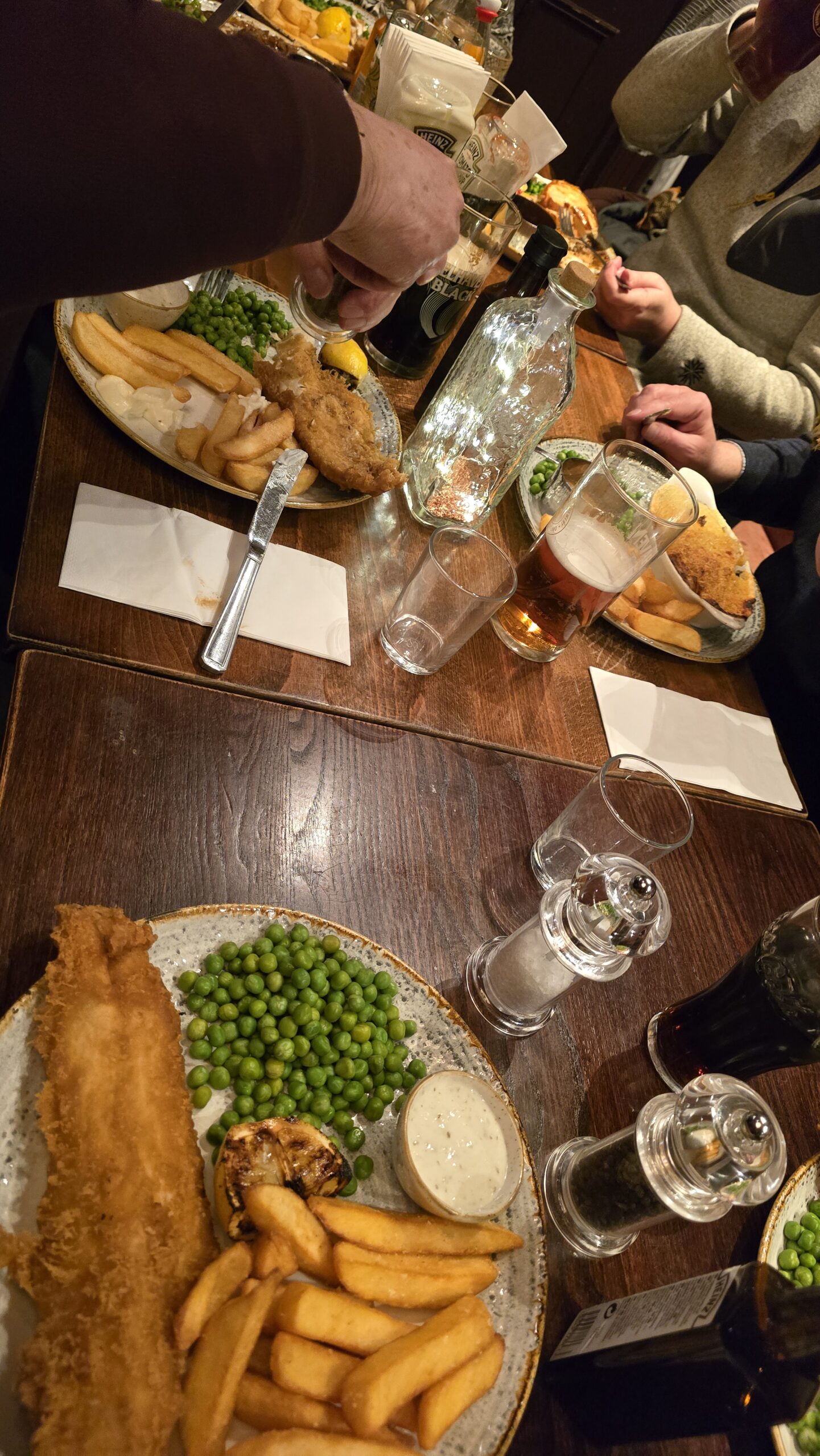 Am Abend treffen wir uns wieder in der Lobby und fahren zum Pub. Einige sind bereits vor Ort, also nichts wie hinein in den „Beehive Inn“. Wir können separat oben sitzen, da sind dann auch Gespräche möglich, da es nicht so laut ist. Das Essen hatetn wir bereits bei der Ankunft jeder aussuchen können und so freuen wir uns auf Klassiker wie „Fish& Chips“, Steak Ale Pie oder Haggis Pie. Ein schöner Ausklang unseres letzten Abends hier.